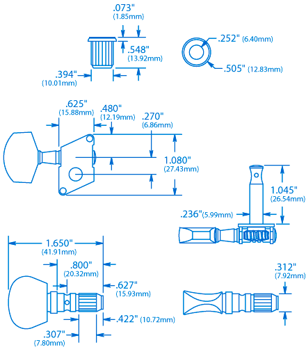 L’ensemble comprend quatre dispositifs mécaniques de type guitare à engrenages ouverts, ainsi que des bagues pour adapter les dispositifs de mécaniques aux trous de cheville de 3/8 po de diamètre.Ces mécaniques ont un 14:1 rapport et comprennent des vis de montage. La cheville de friction de 5ème corde non engrenagee a une vis de tension. Tous les mécaniques sont équipés de boutons en plastique nacré.
