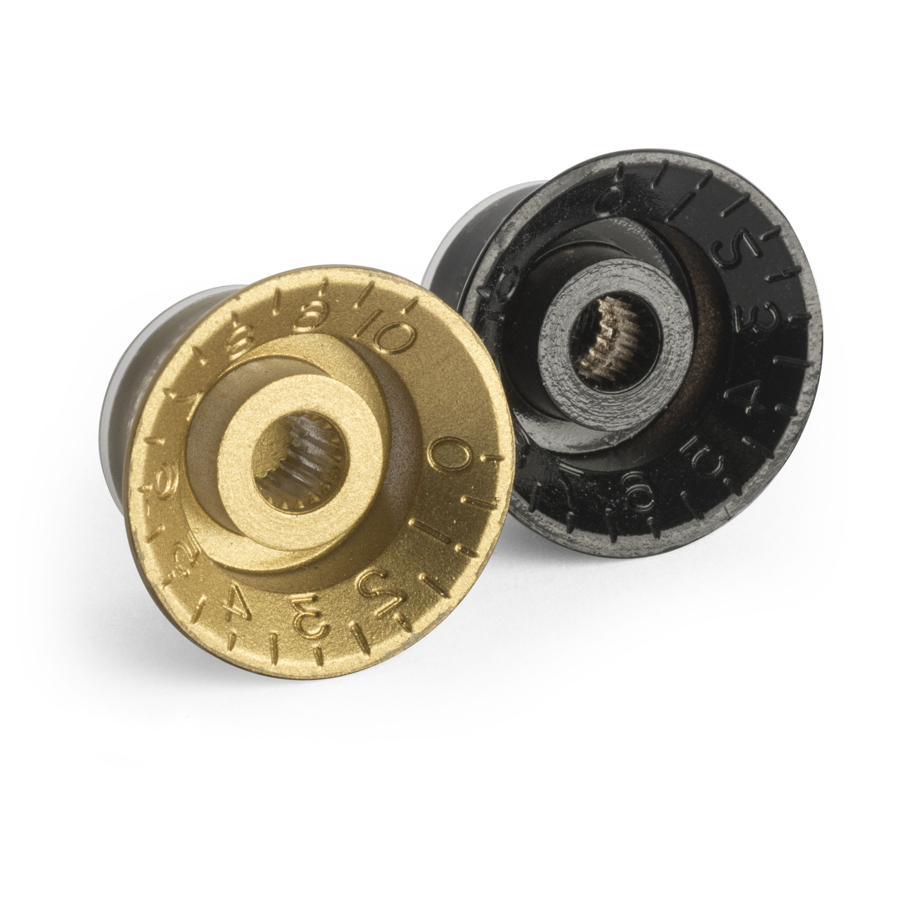 Boutons de volume et de tonalité en forme de cloche avec dessus en métal. Les chiffres sont moulés directement dans le plastique et non peints.