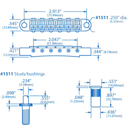 Les selles métalliques ont des rainures de démarrage utiles pour guider vos limes à fente. Les vis d'intonation sont retenues par des mini écrous hexagonaux. Comprend des goujons et des douilles filetés pour molette. Utiliser une mèche 11 mm pour installer les bagues.