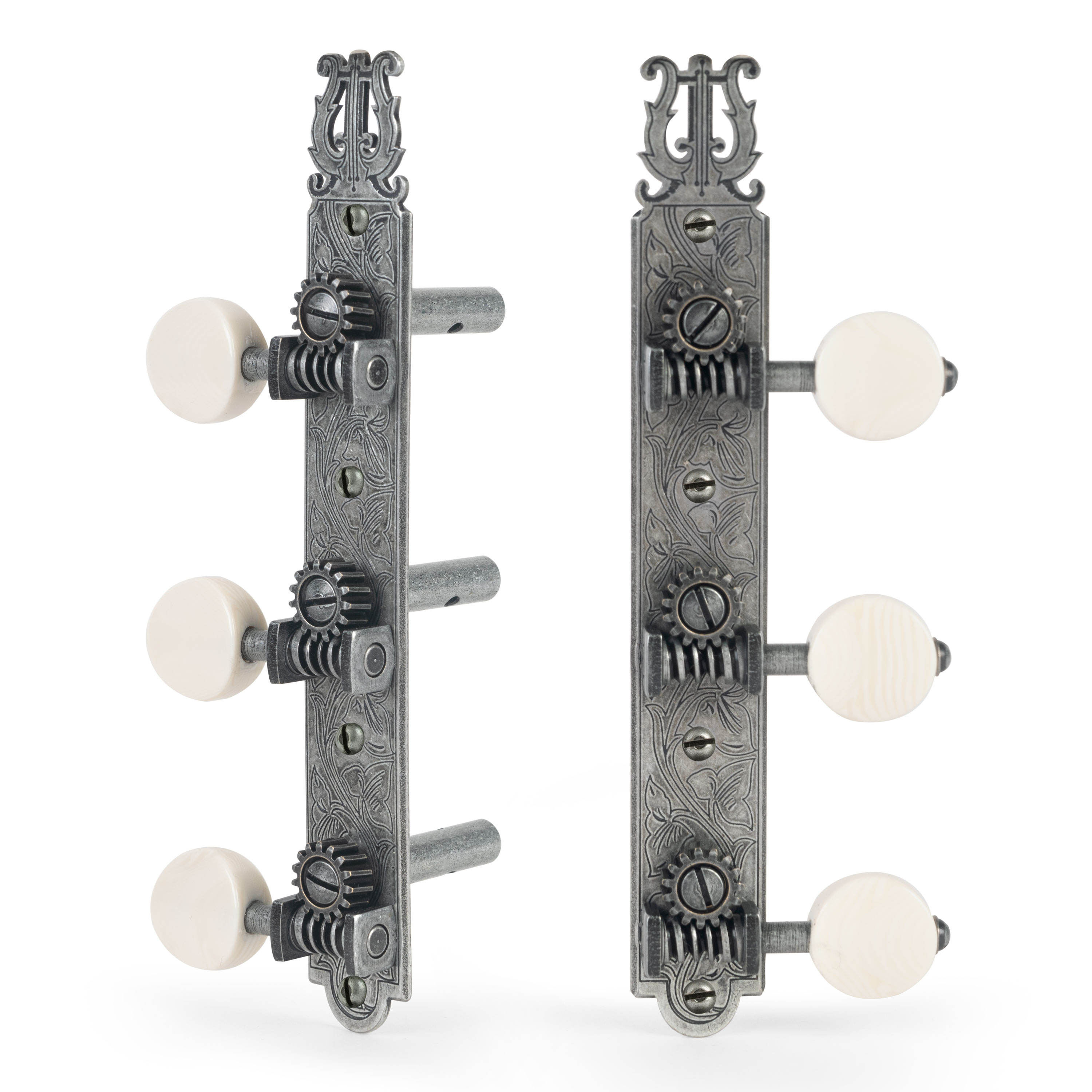Les modèles de pneus ornent les plaques de base en acier gravées et les engrenages à vis sans fin sont montés sur des supports carrés de style ancien. Ces tuners sont également équipés de l’engrenage inversé « vis sans fin sous la tige » populaire au début du XXe siècle.