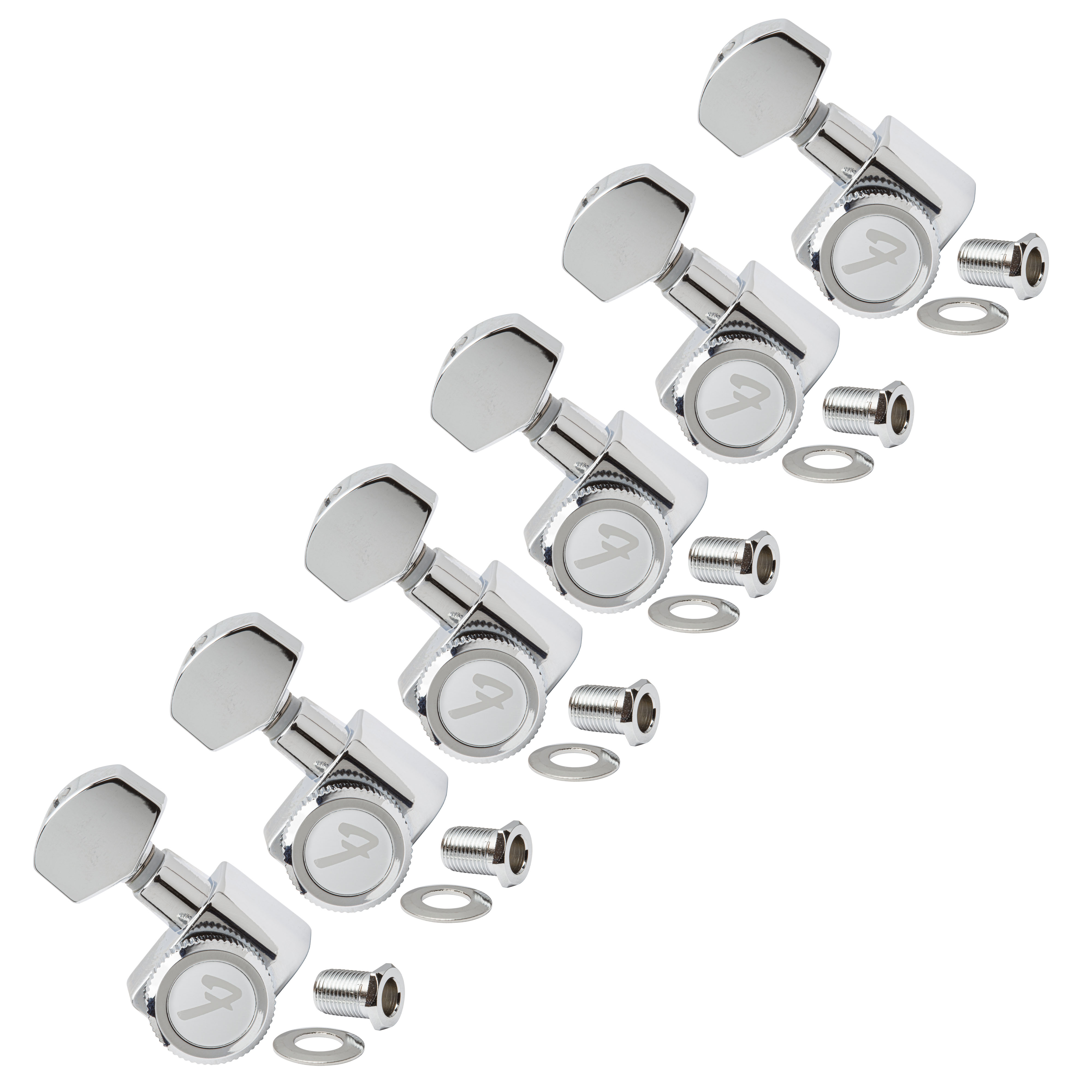 Jeu de six mécaniques verrouillables 6 en ligne conçus pour s’adapter à la plupart des guitares électriques Fender de style moderne avec une configuration de montage à deux broches. Les mécaniques de montants hauts sont utilisés pour les cordes enroulées et les mécaniques montants plus courts sont utilisés pour les cordes simples. Les mécaniques augmentent l'angle de rupture sur l'écrou et améliorent la stabilité du réglage.