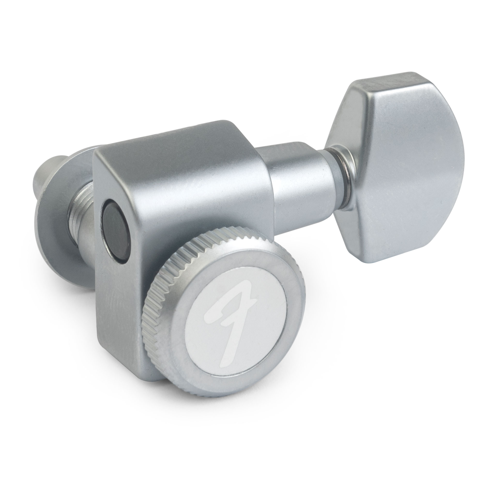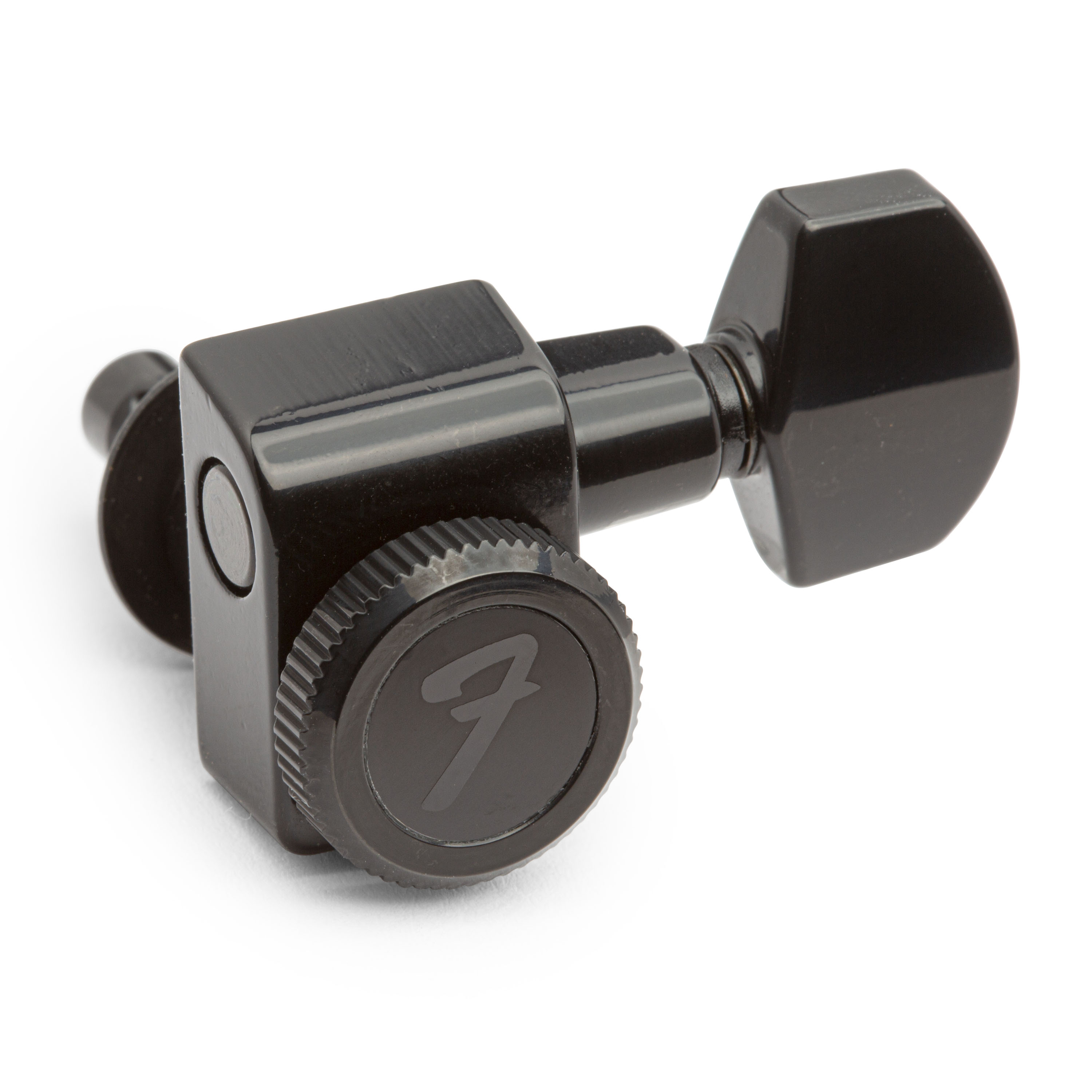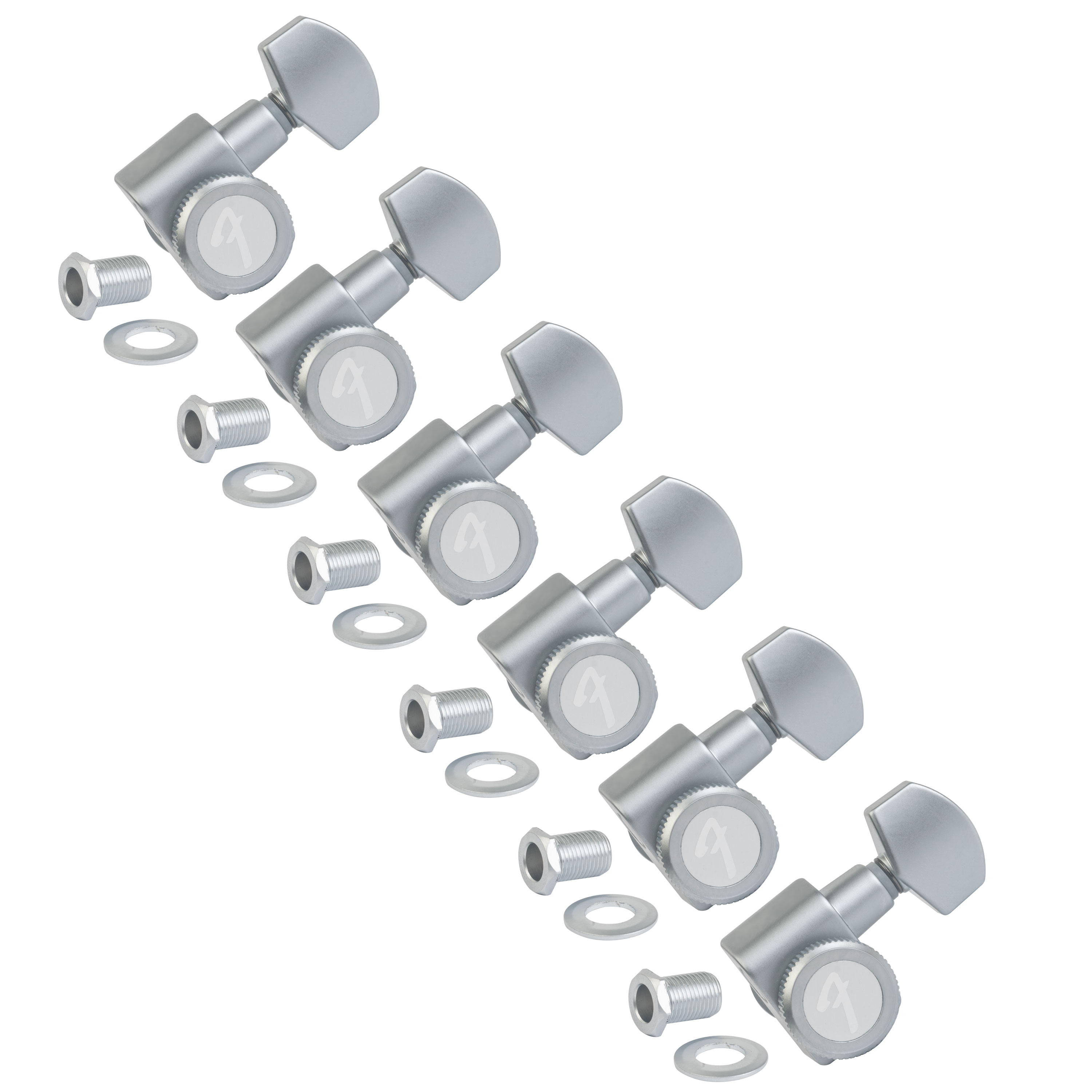 Jeu de six mécaniques verrouillables 6 en ligne conçus pour s’adapter à la plupart des guitares électriques Fender de style moderne avec une configuration de montage à deux broches. Les mécaniques de montants hauts sont utilisés pour les cordes enroulées et les mécaniques montants plus courts sont utilisés pour les cordes simples. Les mécaniques augmentent l'angle de rupture sur l'écrou et améliorent la stabilité du réglage.