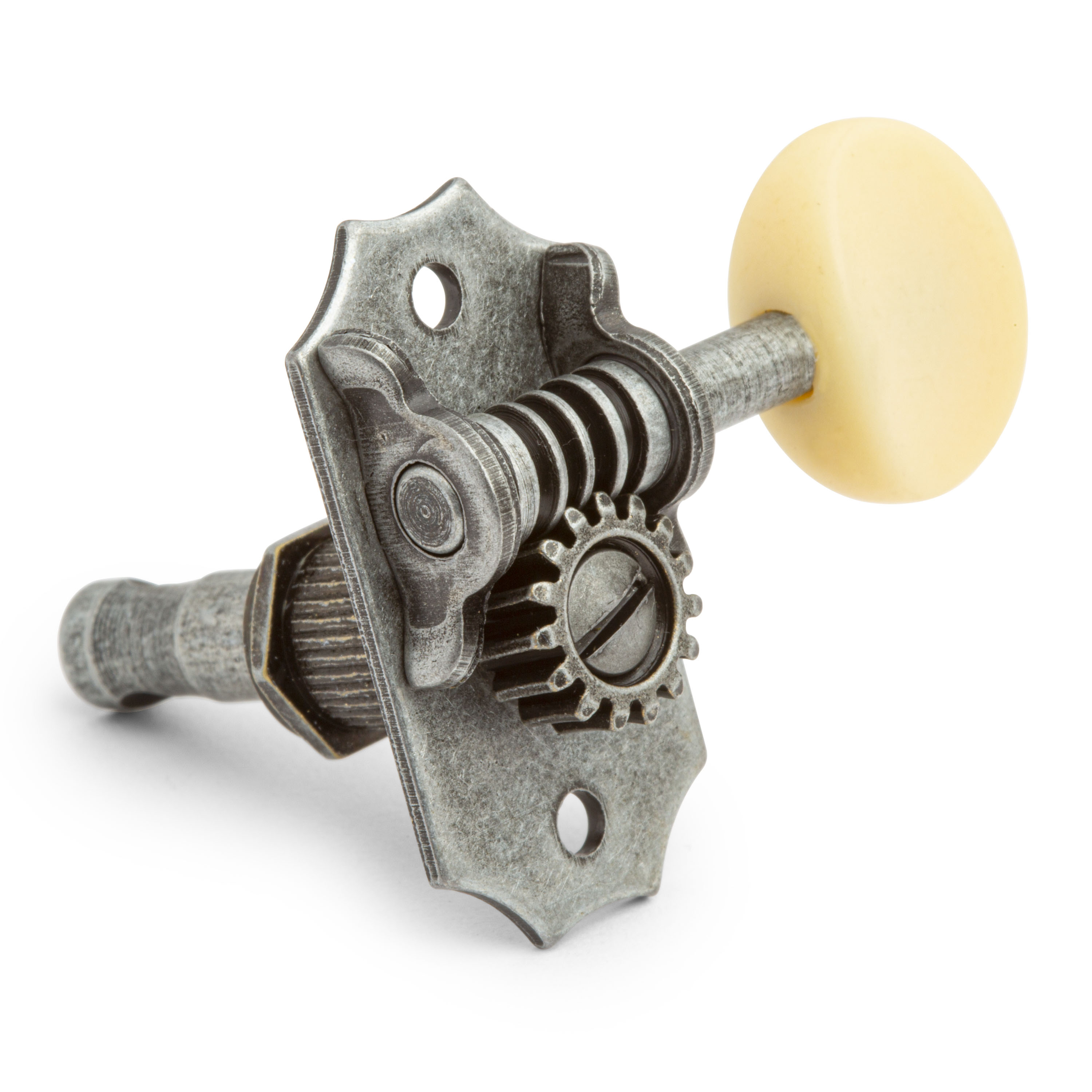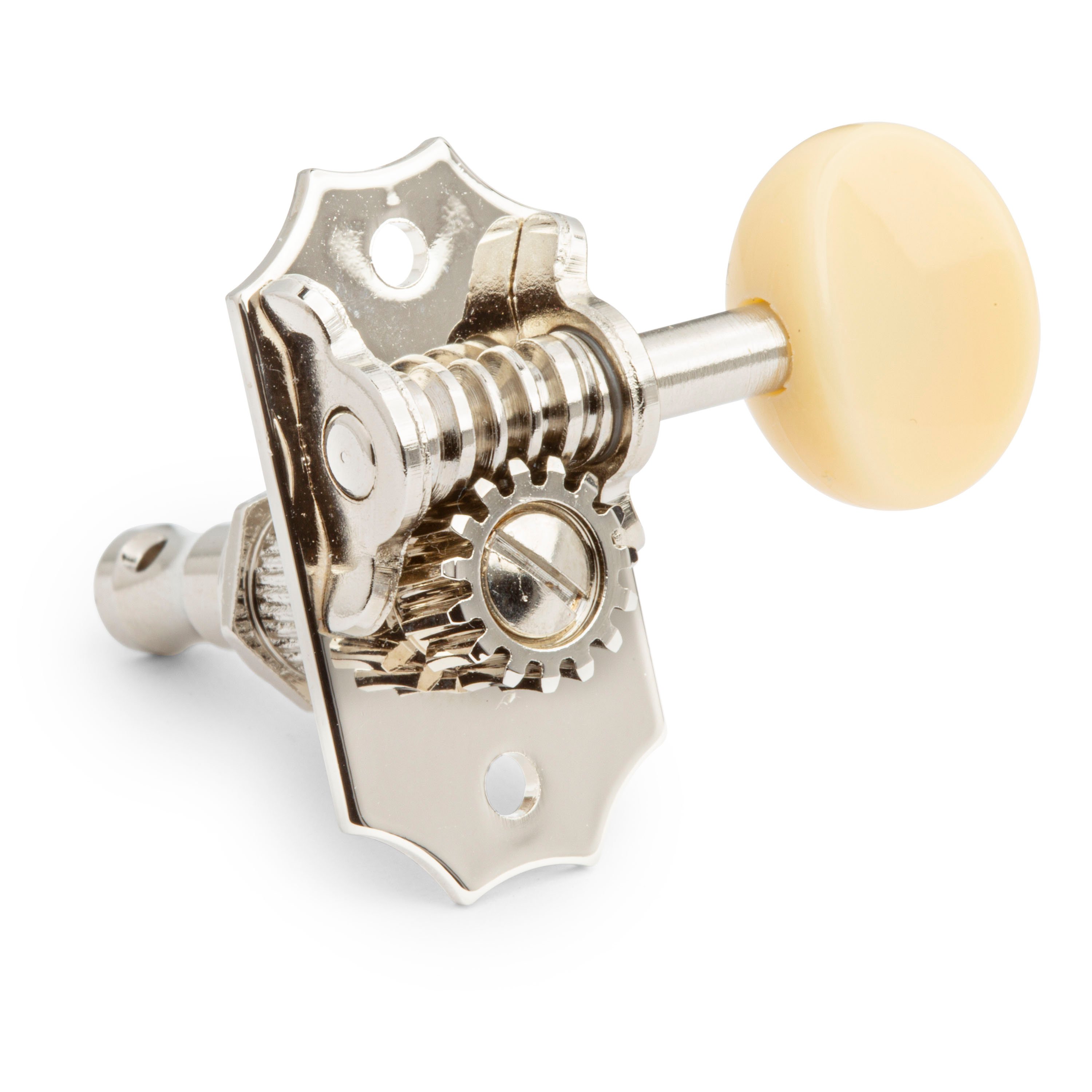 Les mécaniques en nickel Relic ont des boutons en plastique crème avec une finition mate.