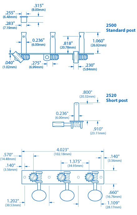 Tige courte également disponible : tiges courtes de style original spécialement conçues pour les têtes de cheville pleines d’épaisseur conique, telles que les guitares Gibson® L-0, L-00, J-45, J-35 et Nick Lucas d’avant-guerre.