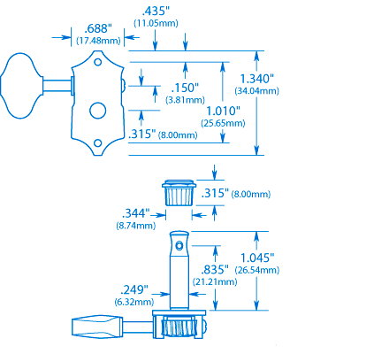 Chaque syntoniseur présente un rapport 18:1 de vitesse pour un réglage fin, une plaque de base moulée, des boutons festonnés de style vintage, des roulements à vis sans fin en nylon et une vis de tension pour un fonctionnement fluide.Ensembles de 6 (3 à gauche/3 à droite). Chaque jeu comprend des vis de montage et des douilles moletées à placage de tête press-fit. Trous de cheville de 11/32" (8,73 mm) de diamètre requis.