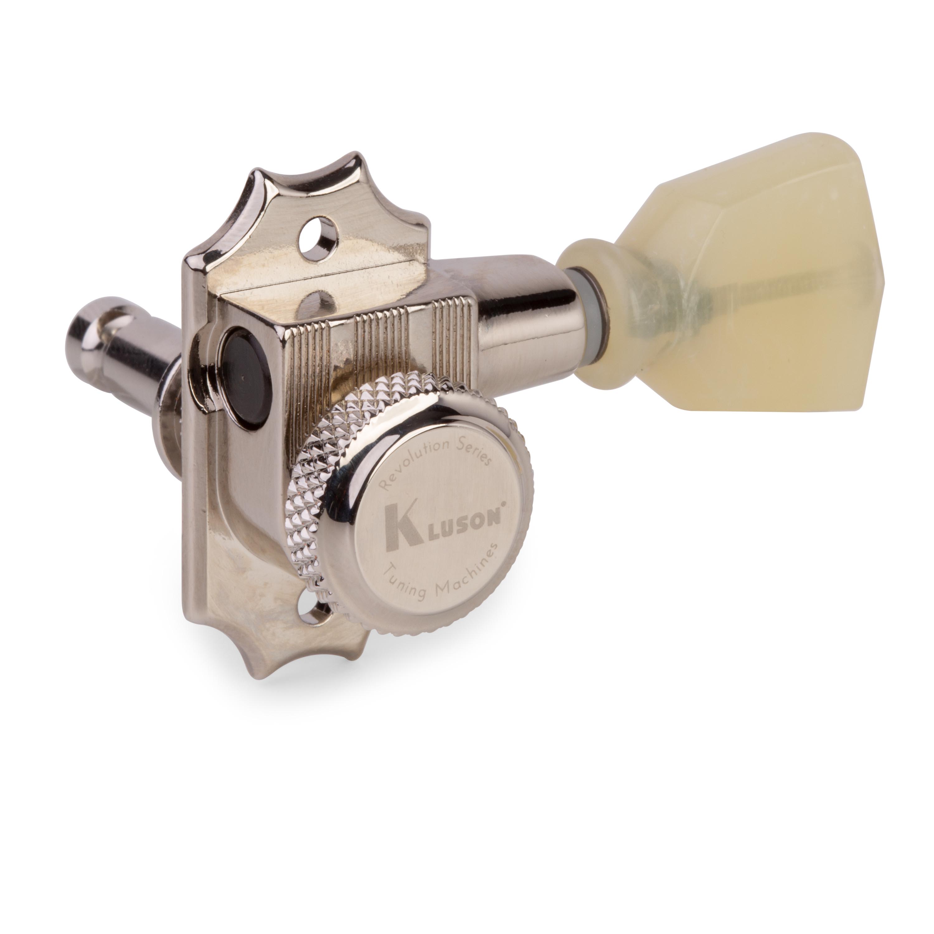 La machine de réglage Kluson Revolution G-Mount à rapport 19:1 élevé. Kluson a véritablement introduit un nouveau modèle avec son empreinte traditionnelle et son nouveau boîtier étanche moulé sous pression. Ces machines de réglage de pointe sont conçues pour moderniser directement les machines de réglage vintage avec une bague à ajustement par pression et ajouter un mécanisme de verrouillage de interrupteur arrière, un modèle de montage traditionnel à deux vis Kluson et un trou de cheville vintage de 11/32" (8,8 mm).