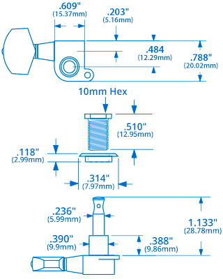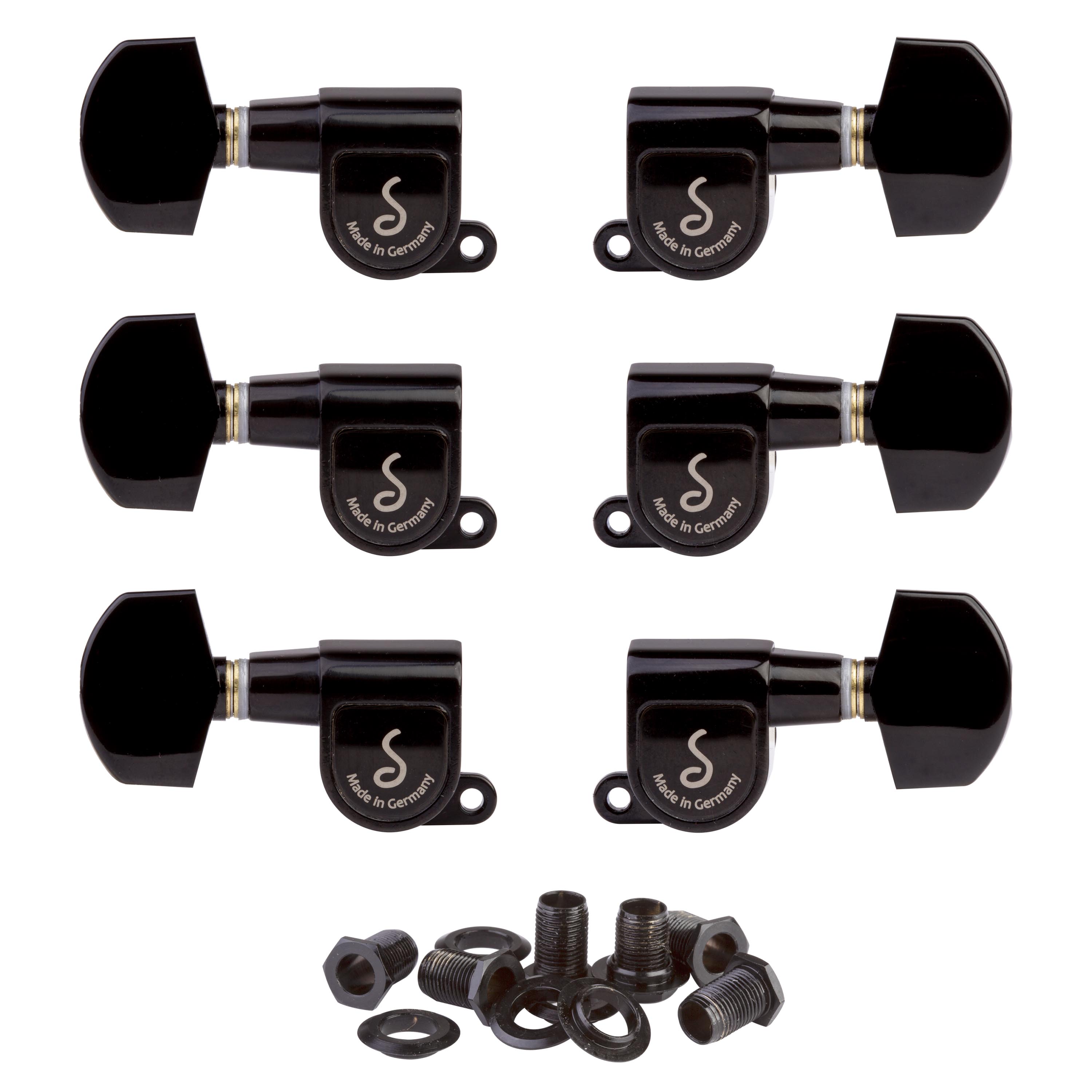 Tous les mécaniques Schaller M6 nécessitent des trous de cheville de 10 mm (13/32") de diamètre. Vendu par jeux de 6, avec vis de montage, bagues filetées et rondelles incluses.