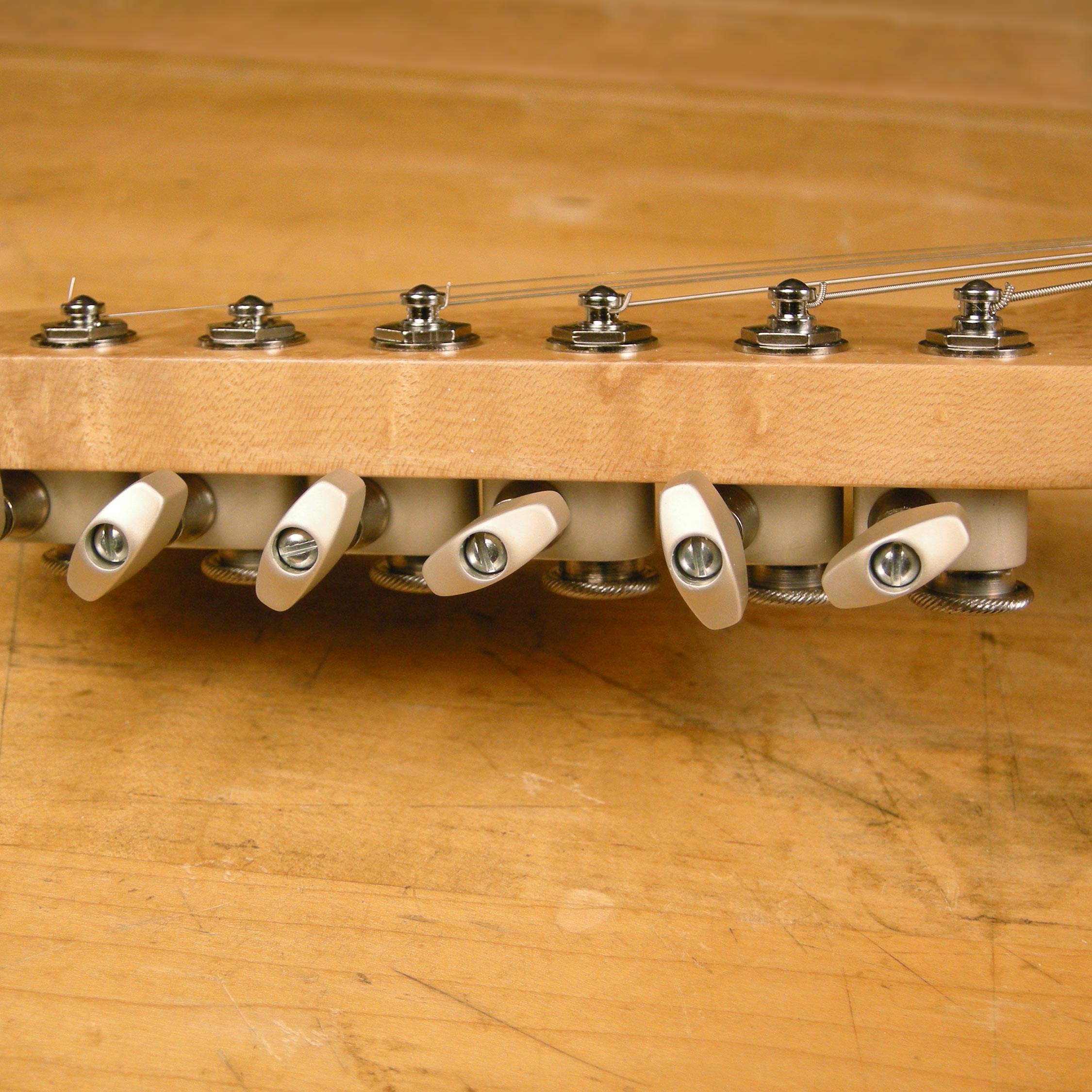 Les mécaniques Sperzel 6 en ligne comportent 3 hauteurs de montants de corde dans chaque jeu. Les deux mécaniques les plus hauts sont utilisés sur les chaînes E et A, les montants de longueur moyenne sont utilisés sur les chaînes D et G, et les deux montants les plus courts sont pour les chaînes B et E. Cela permet aux chaînes E, B, G et D d’avoir un angle plus raide par rapport à l’écrou que les mécaniques traditionnels, éliminant ainsi le besoin d’arbres à chaînes.