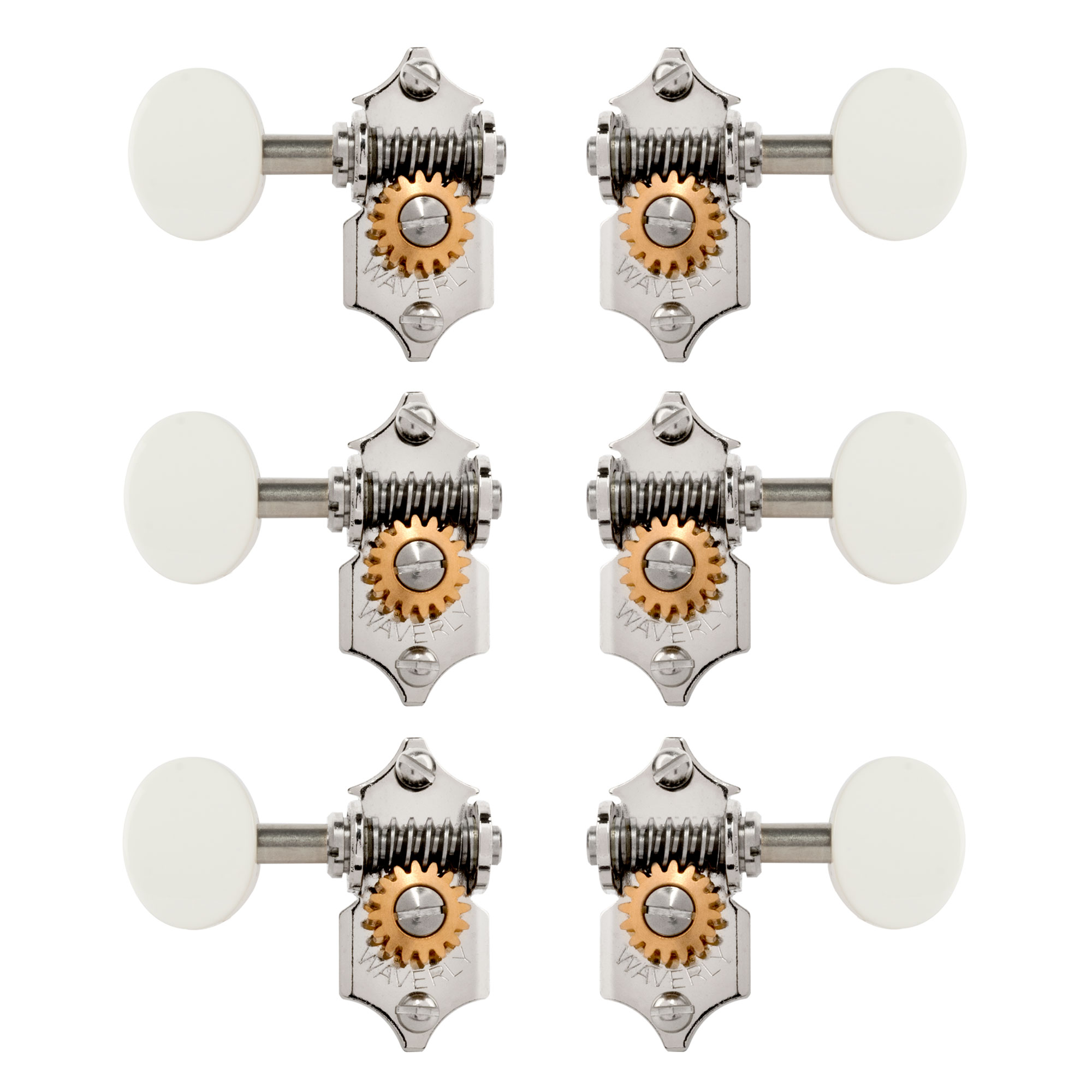 Tuning Machines : le choix de guitaristes renommés pour leurs instruments les plus fins. Les Waverlys sont dotées de tiges à corde coniques de style ancien et de douilles hexagonales en laiton press-fit. Engrenages à vis sans fin en acier inoxydable avec rapport 16:1 de vitesse. Vis incluses avec cet ensemble de 6 pour 3,3 têtes de cheville pleines. Également vendu séparément