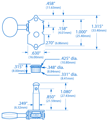 Des bagues de placage de tête de conversion sont disponibles pour installer les machines de réglage Waverly dans des trous de chevilles de plus grand diamètre de 3/8" (Grover, Gotoh, Schaller, etc.).