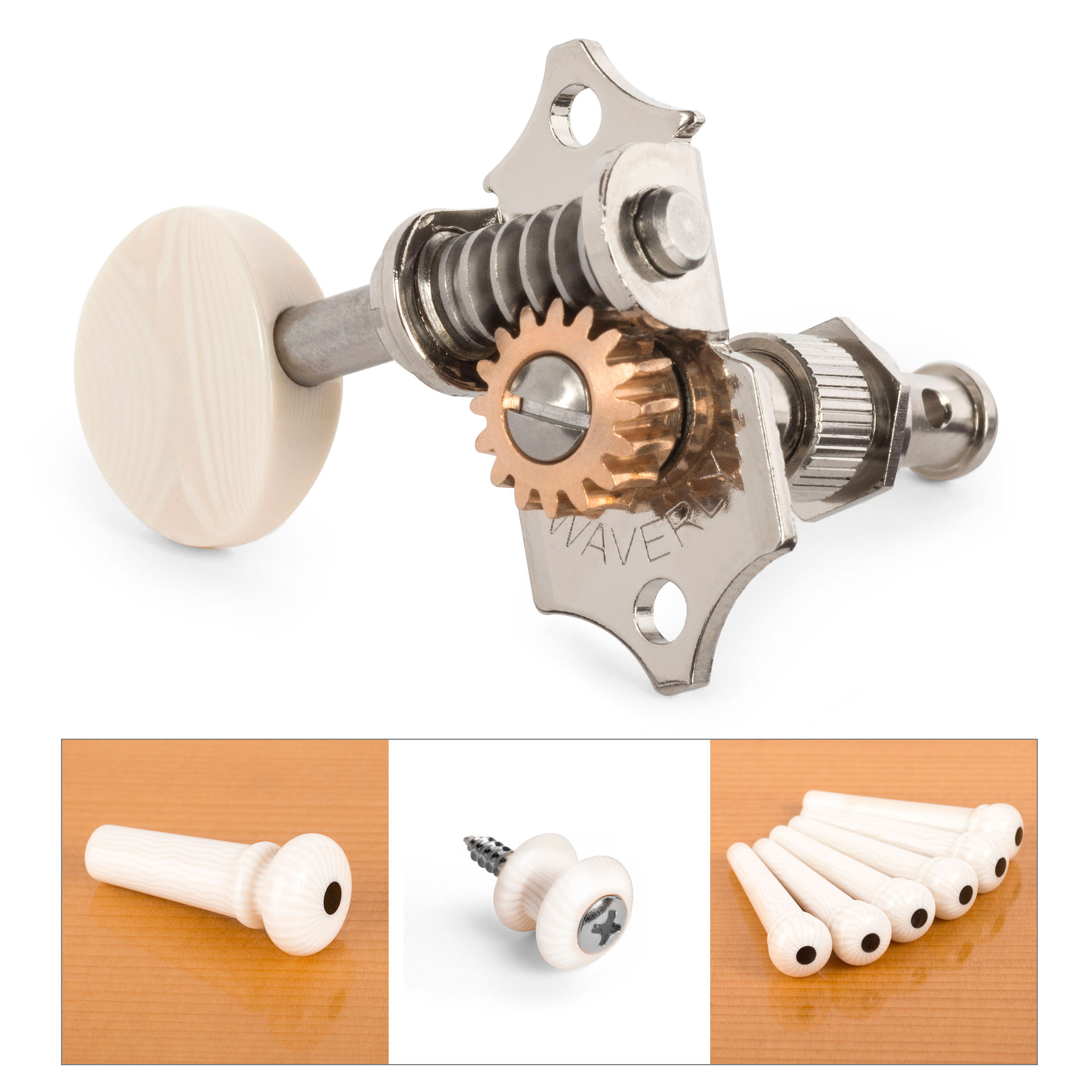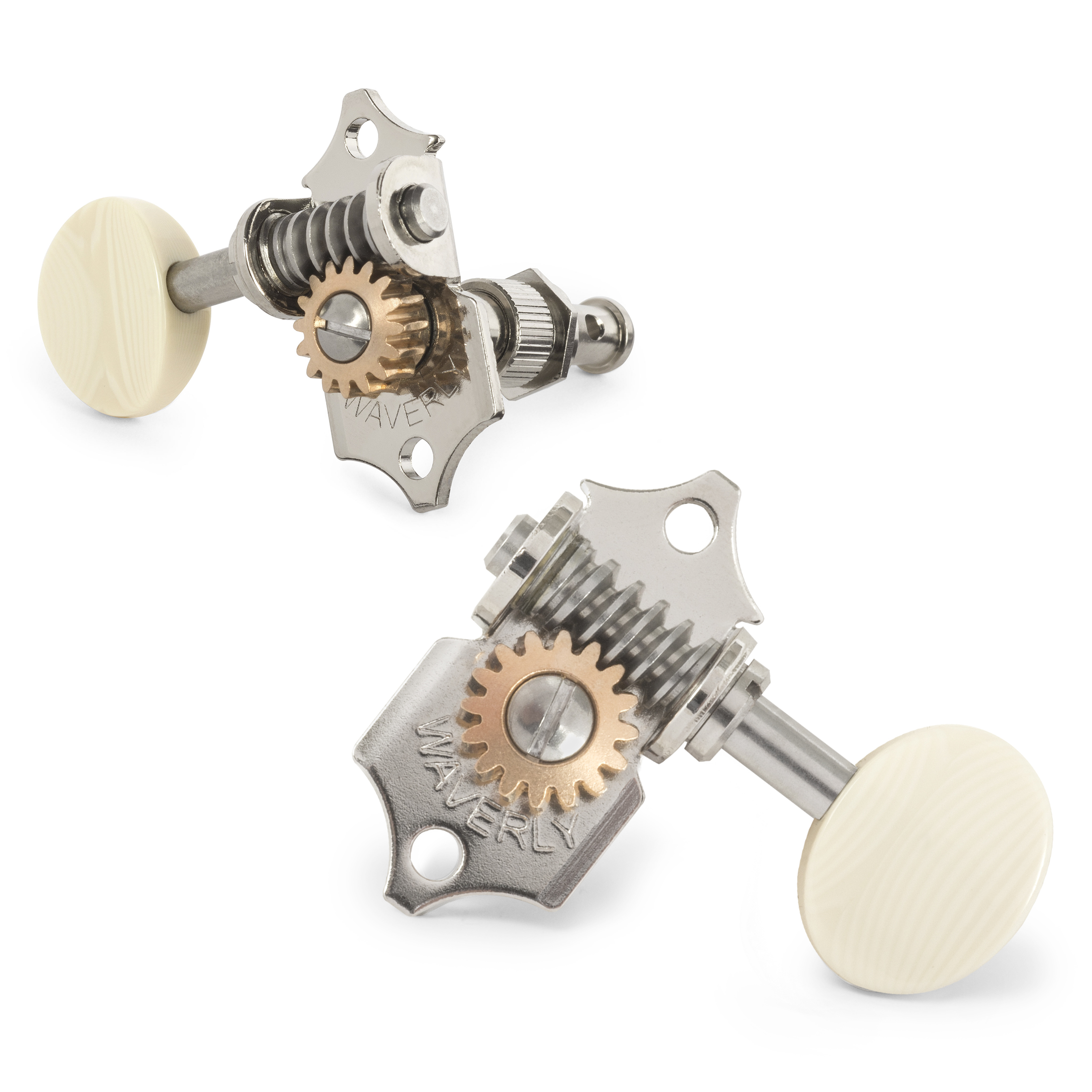 Avec les mécaniques Waverly, vos guitares sont bien accordées et le restent. La conception brevetée de Waverly associe l'acier inoxydable au bronze pour créer un réglage lisse et antidérapant. Les machines Waverly sont mécaniques pour remplacer les instruments de valeur. Elles sont faites à la main pour s’adapter précisément sans forer sur les guitares Martin et Gibson plus anciennes. Des fabricants tels que C.F. Martin, Gibson, Collings, Santa Cruz, Huss & Dalton, Sams et Bourgeois choisissent Waverlys pour leurs instruments les plus raffinés.
