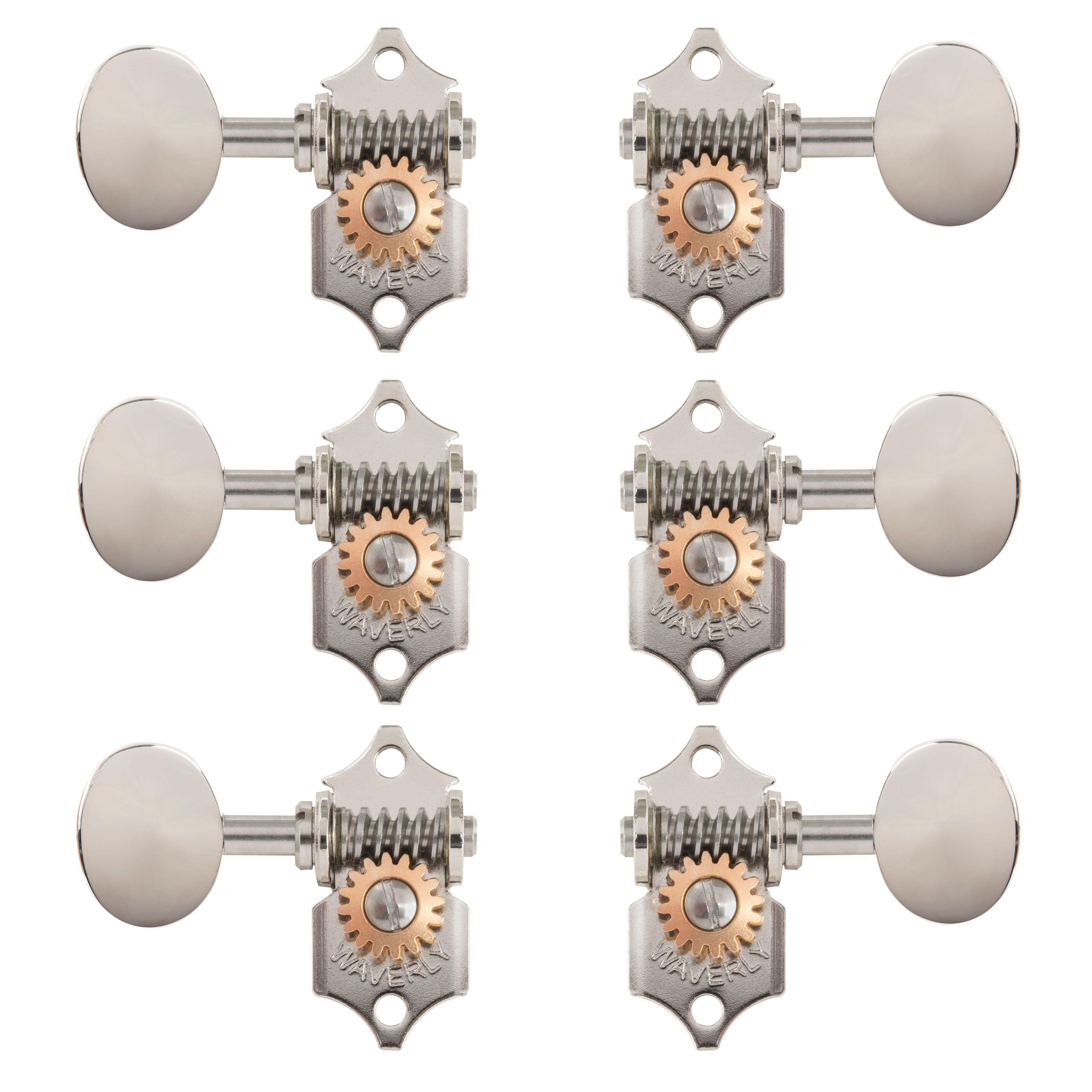 Tuning Machines : le choix de guitaristes renommés pour leurs instruments les plus fins. Les Waverlys sont dotées de tiges à corde coniques de style ancien et de douilles hexagonales en laiton press-fit. Engrenages à vis sans fin en acier inoxydable avec rapport 16:1 de vitesse. Vis incluses avec cet ensemble de 6 pour 3,3 têtes de cheville pleines. Également vendu séparément