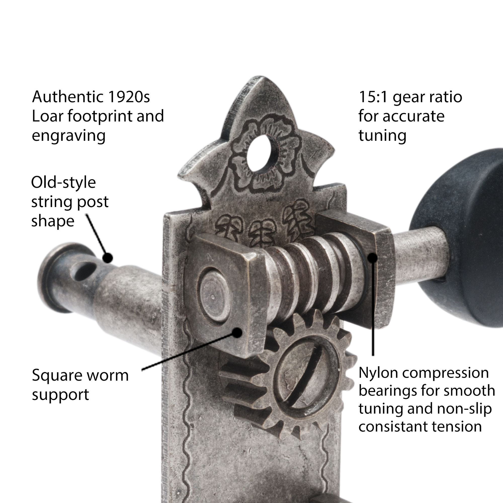Le look est plus authentique que jamais, mais les spécifications de tolérance étroite, les roulements à vis sans fin en nylon et le rapport de 15:1 transmission rendent les Golden Age mécaniques plus lisses et plus efficaces que les machines vintage. Deux finitions de relique optionnelles dupliquent cette patine « bien jouée » qui donne à la plupart des autres mécaniques modernes l’impression d’être johnny-come-lately sur un instrument vintage ou de reproduction. Les plaques de base distinctives en acier Loar-shape ont même la même empreinte et la même gravure que les originaux 19,0s .