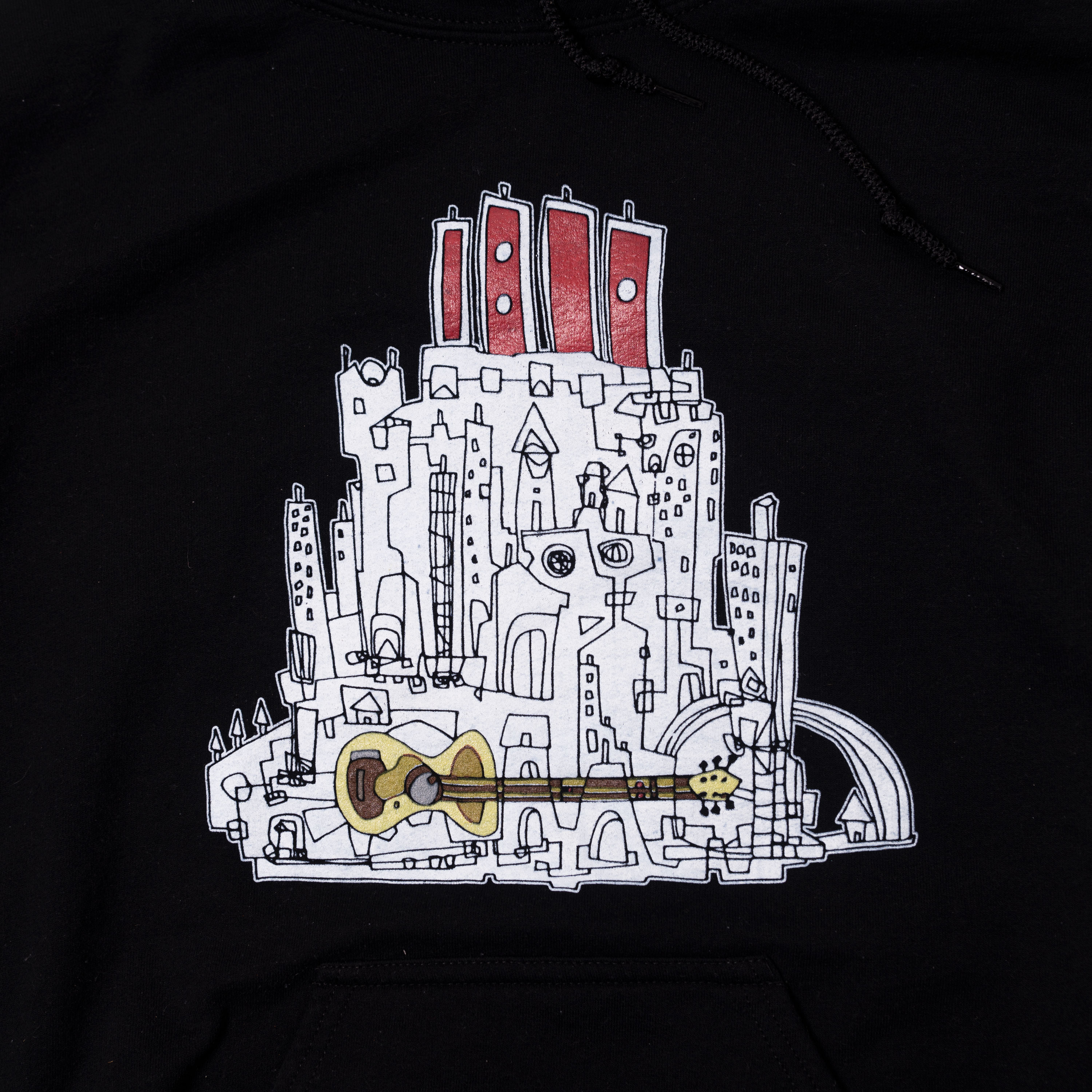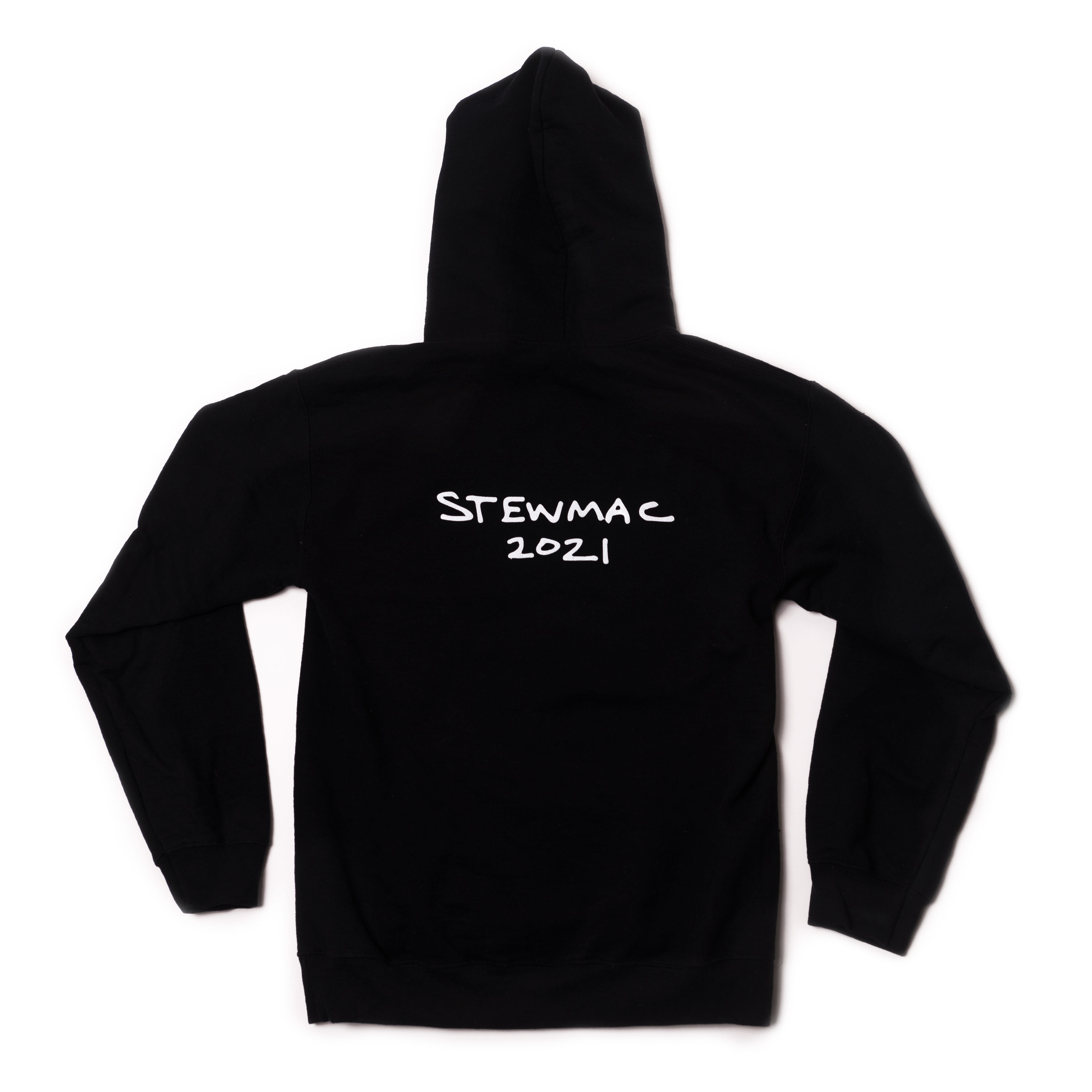 Notre sweat à capuche StewMac by Matthew Carey affiche une vision d’une ville musicale, réinventant complètement notre logo classique.
