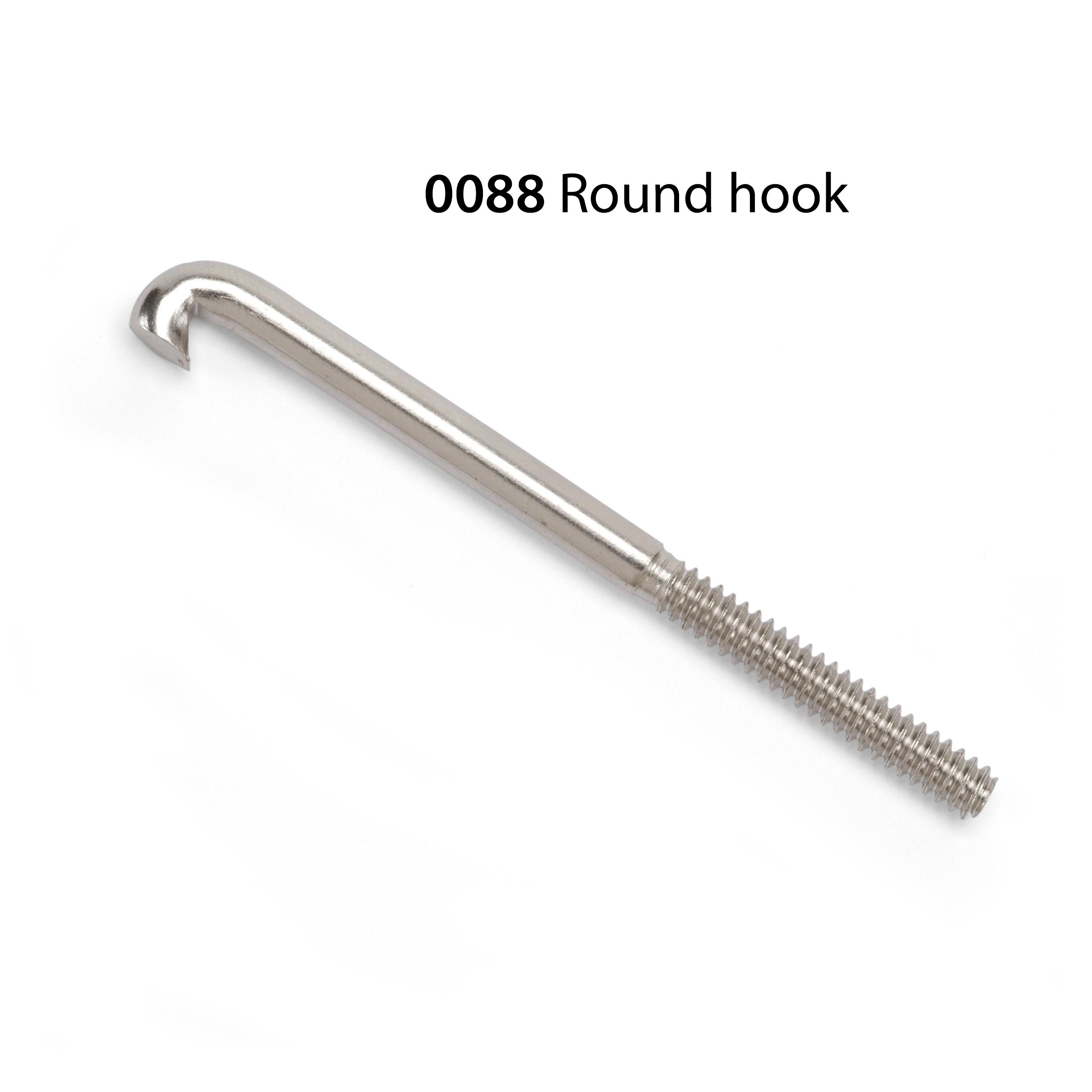 Nos crochets de fixation mesurent 2-1/2 po (63,50 mm po) de long. La partie filetée 8 à 26 mesure 1" (25,40 mm) de long. Les crochets ronds ont un diamètre de 0,1,8" (4,01 mm) ; les crochets plats ont un diamètre de 0,1,8" (3,51 mm).