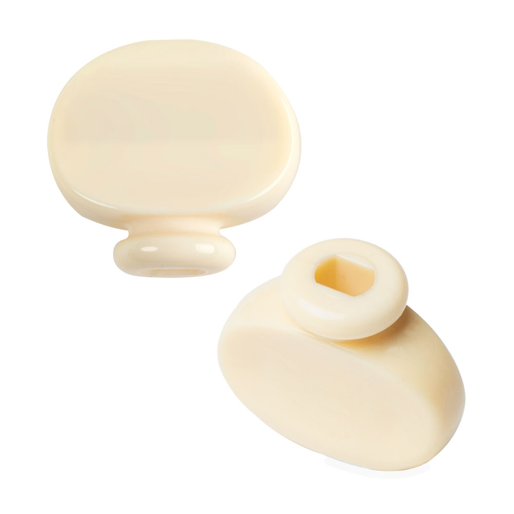 - Les boutons ivoroïdes sont usinés à partir de Galalith, un matériau dense et durable à base de caséine qui polit magnifiquement. Il ressemble à de l’ivoire véritable, mais il s’agit d’une alternative non animale.
