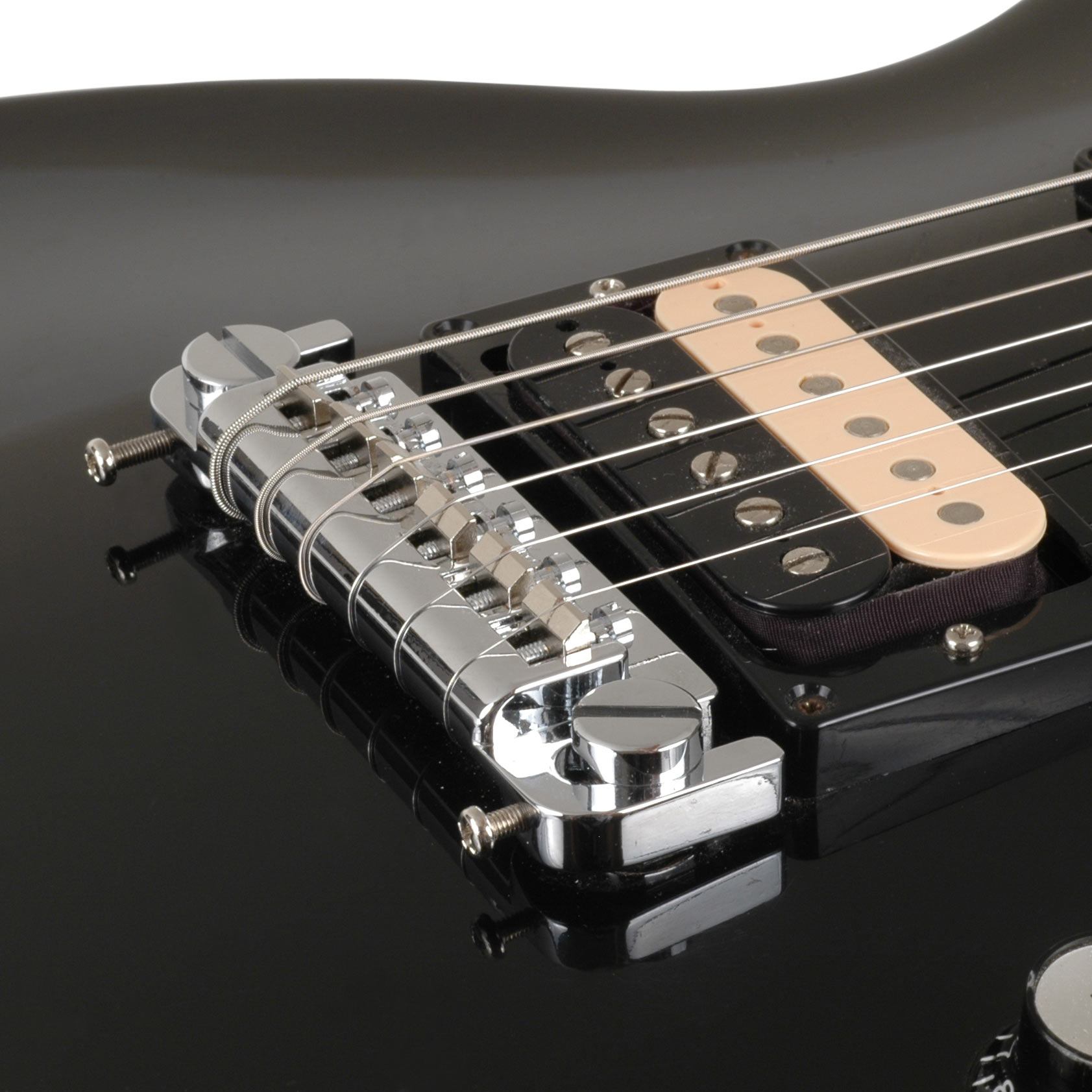 Deux vis d'alignement permettent d'ajuster l'intonation globale. Les goujons de montage réglables en hauteur comprennent des bagues moletées. Les cordes se chargent depuis l’avant de la base moulée sous pression, s’enroulent sur l’arrière du pont et sur les selles crantées. Percez des trous de 7/16" (11 mm) pour les bagues.