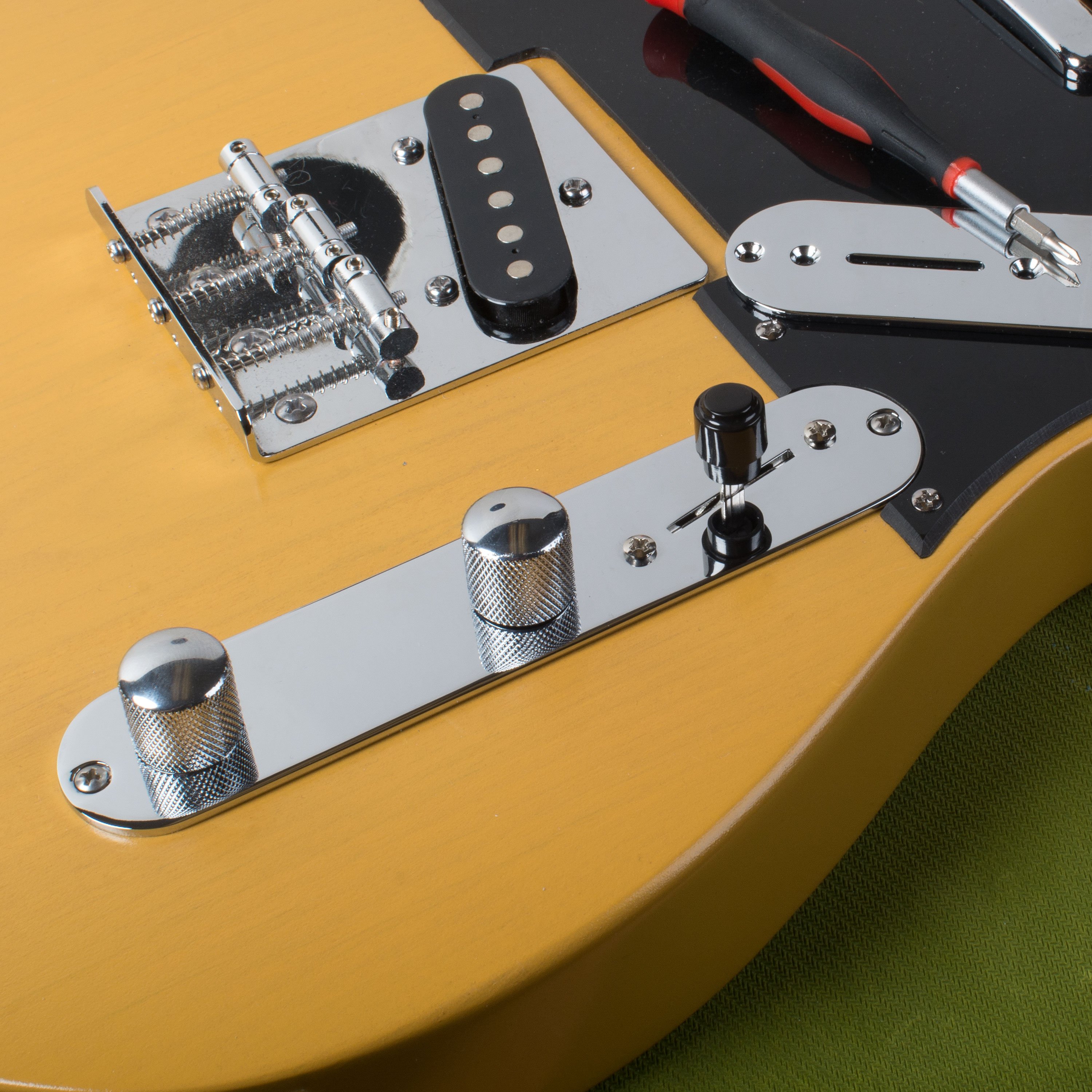 Cette plaque de commande Tele en laiton plaqué a la même empreinte que l’original classique, mais l’emplacement du sélecteur est légèrement déplacé vers l’avant et incliné. Maintenant, il est facile de placer votre doigt entre l’ sélecteur et le interrupteur de volume, plus besoin de fuir ou d’acrobatiques.
