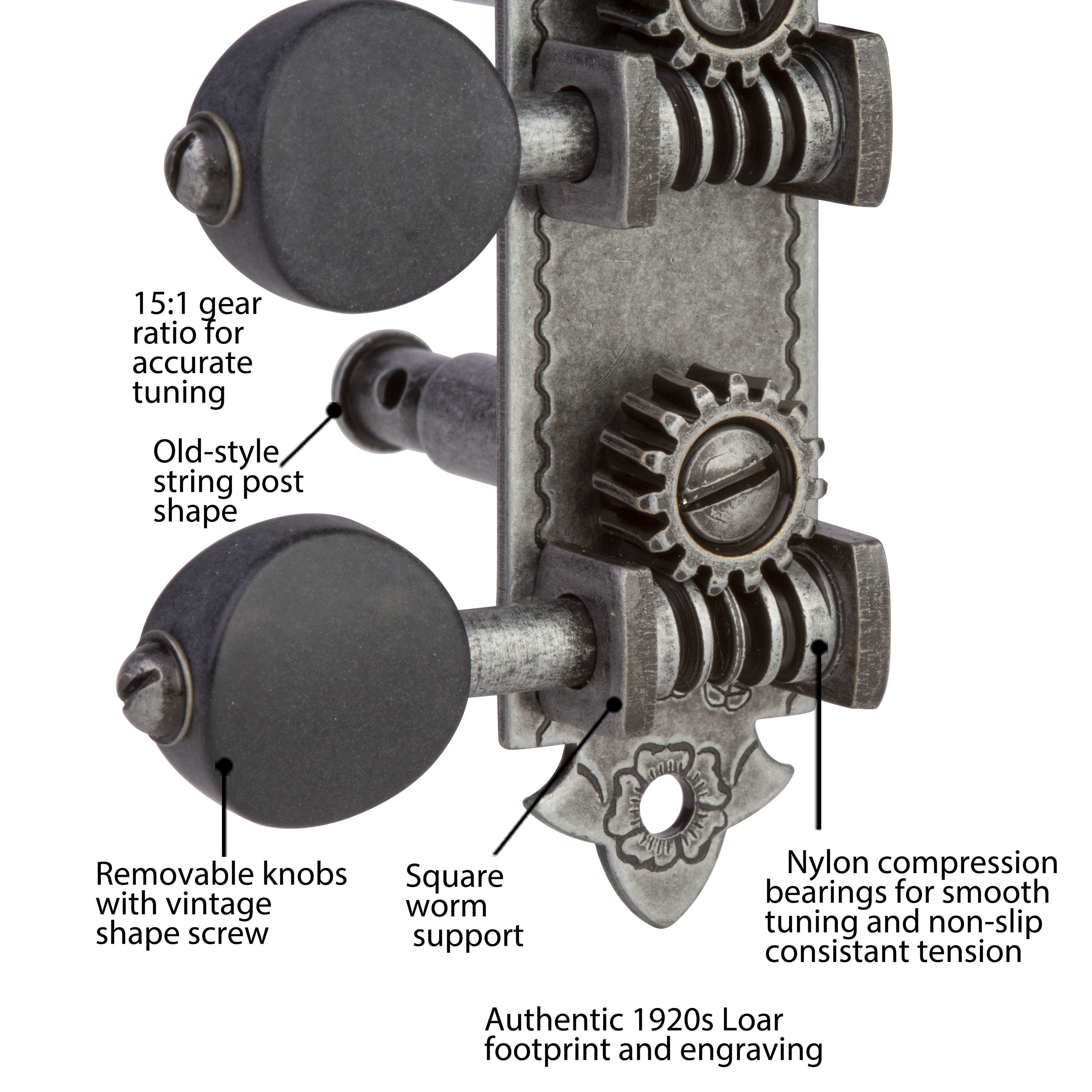 Le look est plus authentique que jamais, mais les spécifications de tolérance étroite, les roulements à vis sans fin en nylon et le rapport de 15:1 vitesse rendent les mécaniques Golden Age plus lisses et plus efficaces que les machines vintage. Deux finitions de relique optionnelles dupliquent cette patine « bien jouée » qui donne à la plupart des autres mécaniques modernes l’impression d’être johnny-come-lately sur un instrument vintage ou de reproduction. Les plaques de base distinctives en acier Loar-shape ont même la même empreinte et la même gravure que les 1920s originaux.