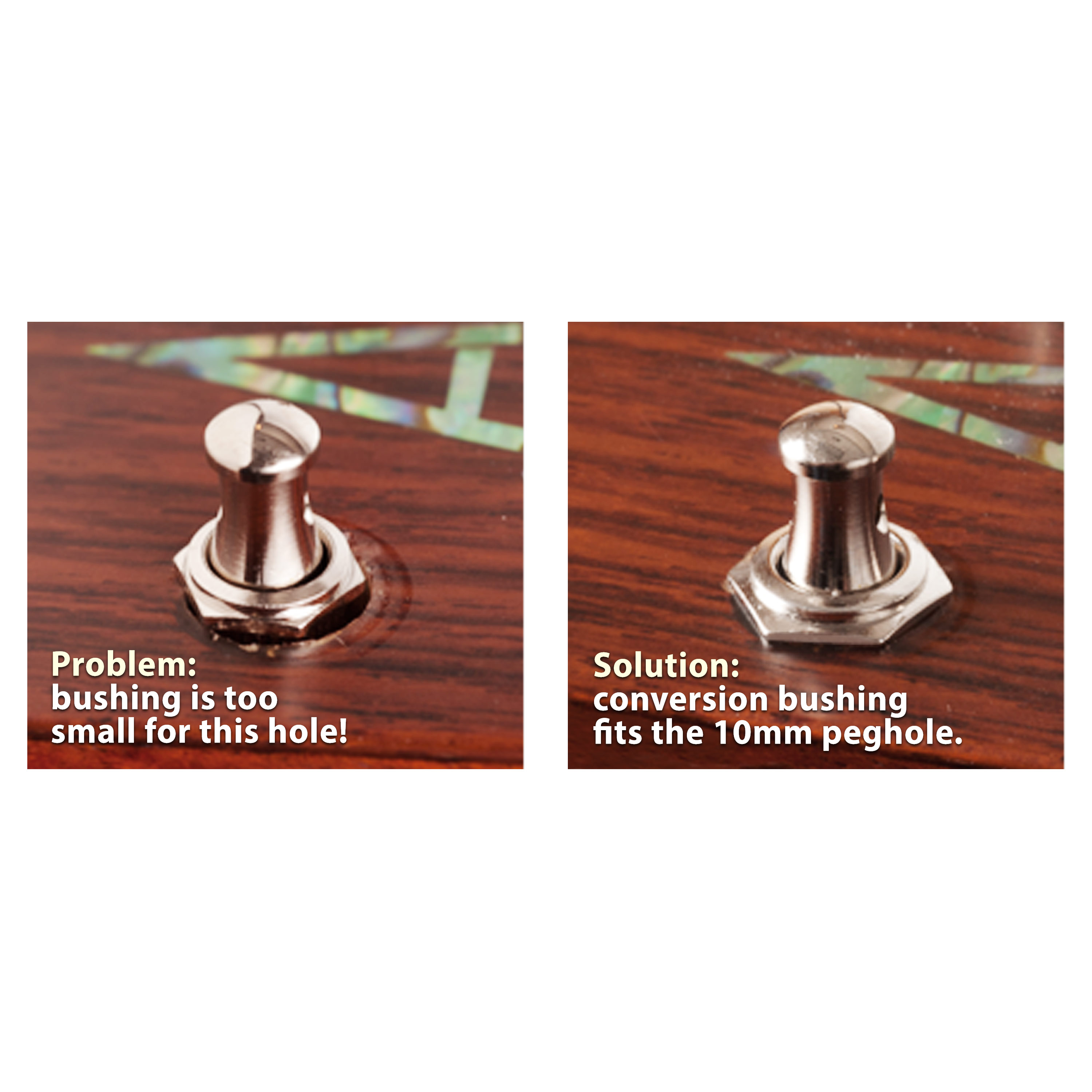 Remarque : ces bagues de conversion ne fonctionneront pas sur les instruments avec des trous de cheville 10,5 mm . Mesurer le diamètre du trou du tuner avant de commander.