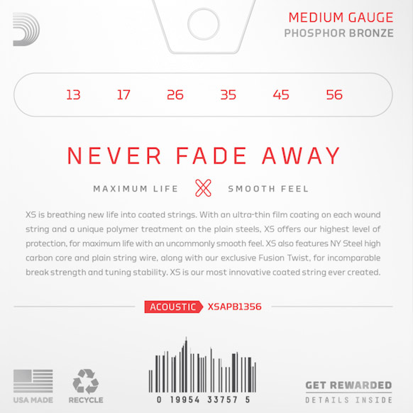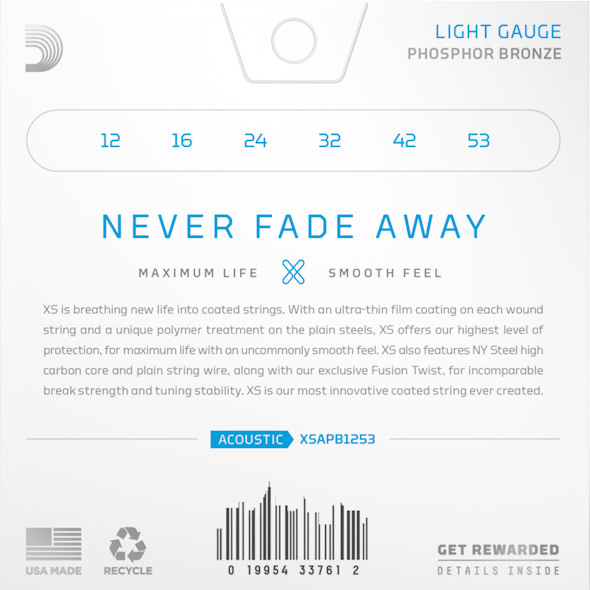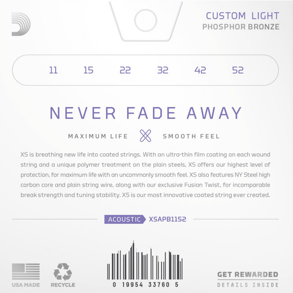 « Issu de notre plus grande percée dans l’innovation en matière de cordes, les cordes XS Phosphor Bronze ont la plus longue durée de vie de toutes les cordes de guitare acoustique D’Addario. Le revêtement XS donne à nos cordes en bronze phosphoreux chaudes et équilibrées une durée de vie maximale, avec une sensation exceptionnellement douce. Dotées d’un noyau en acier NY, d’un fil enveloppant en bronze phosphoreux et de la technologie Fusion Twist, les cordes de guitare acoustiques revêtues XS offrent une résistance à la rupture et une stabilité de réglage incomparables, ainsi qu’une durée de vie considérablement accrue. »