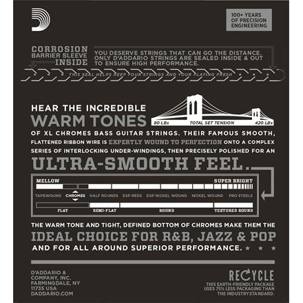Les cordes de basses Flatwound les plus vendues de D’Addario sont réputées pour leur ton chaud et doux et leur toucher lisse et poli. Les chromes offrent une extrémité basse profonde et riche, ce qui en fait le choix de plaies plates des musiciens Jazz, R&B et Pop. S’adapte aux basses à grande échelle avec une longueur d’échelle de corde allant jusqu’à 36-1/4 pouces.