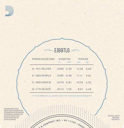 Les sets D’Addario EJ99TLG sont conçus pour être utilisés avec des ukulélés ténors utilisant notre matériau exclusif Pro-Arté’ Carbon. Il s’agit d’un ensemble de matériaux entièrement en carbone, optimisé pour le réglage des ukulélés à faible G.
