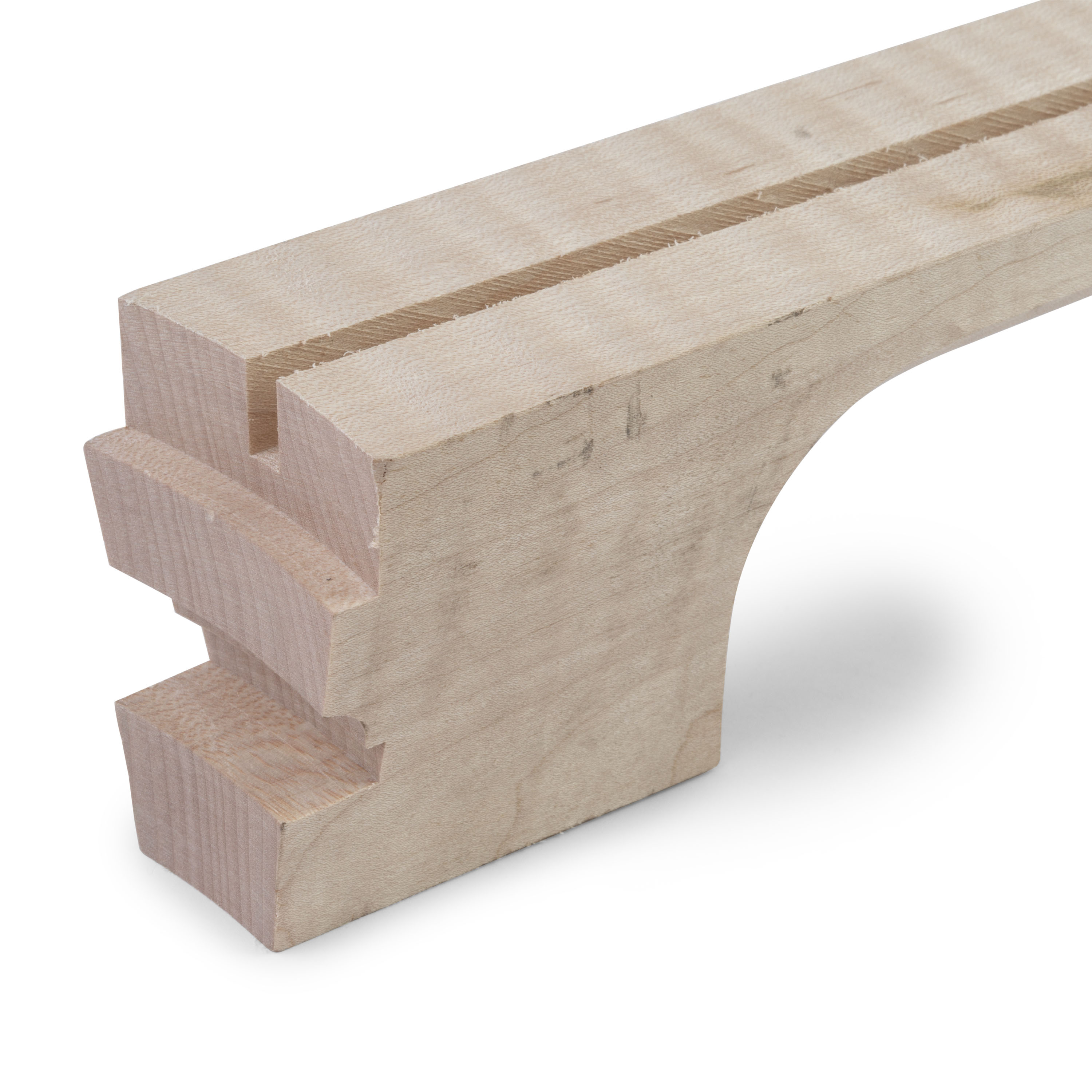 Ce col une pièce de haute qualité avec tête de manche assortie « oreilles ». Nous avons fait le travail difficile des machines, afin que vous puissiez le personnaliser comme vous le souhaitez. Vous gagnerez du temps et n’aurez pas besoin de vous équiper pour des travaux de machine compliqués : le profil du talon et la butée de la tête de manche sont en forme et les surfaces supérieures sont poncées à plat. Percer des trous pour chevilles standard de 3/8 po (10 mm po) de diamètre. Une fente de 7/32" x 7/16" (5,56 mm x 11,11 mm) a été coupée pour s’adapter à notre tige de réglage Hot Rod à écrou hexagonal. La largeur au niveau de l'écrou est de 1-3/16" (30,16 mm). Le trou de mécaniques de la 5ème corde n’est pas percé, et le placage de touche et de la tête de manche ne sont pas inclus.