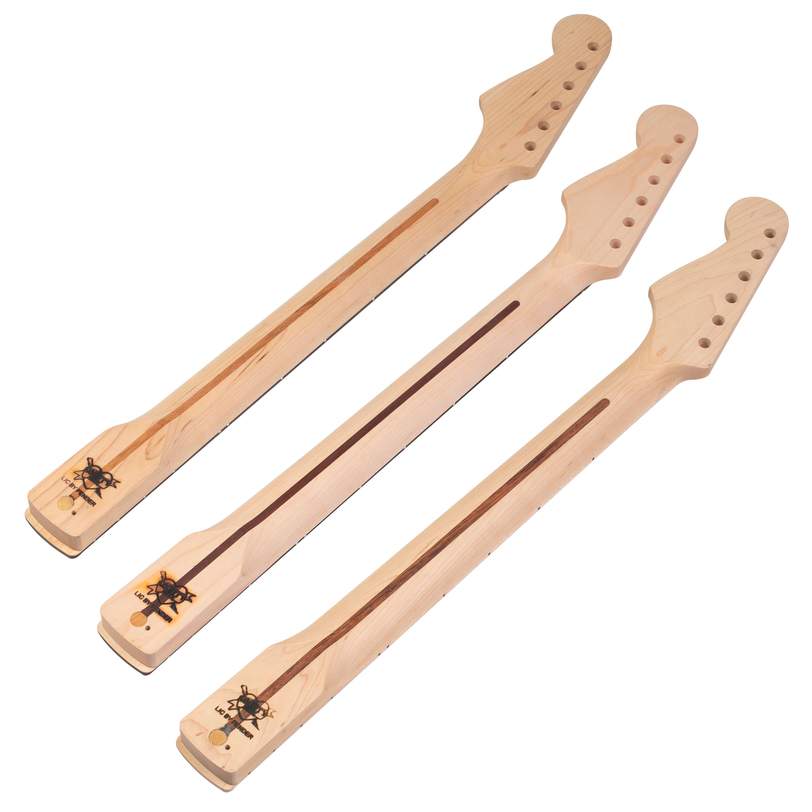 La rayure skunk est le même bois que la touche pour les cous avec des doigts en palissandre indien et en laurier indien. Les cols avec les doigts en érable sont ornés de rayures skunk en bois de merbau.