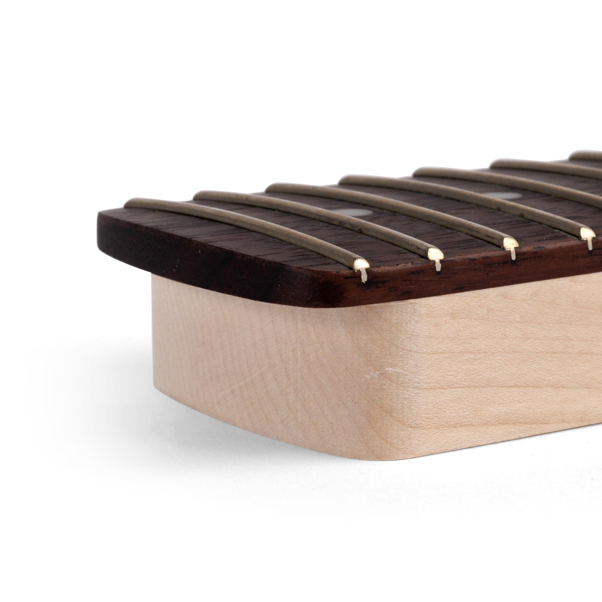 Les 22 cases sont joliment finies. L’écrou à fente est en plastique PPS avec un fond plat. Carré en érable, bois de rose indien ou laurel indien avec incrustations de points et marqueurs latéraux.