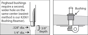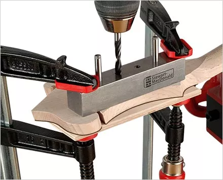 6. La table de la perceuse-presse nécessitera des blocs ou des cales pour niveler une placage de tête conique. Lors de l’utilisation d’une perceuse manuelle, tenir la perceuse sans serrer et laisser le gabarit guider la mèche pour vérifier son équerre. Si possible, toujours commencer chaque trou en tournant la mèche en sens inverse, puis avancer pour percer le trou. Cela permet d’éviter l’écaillage du bois ou de la finition de la placage de tête . 7. Les pins d’alignement en acier doivent être utilisées lors du perçage de trous dans une nouvelle mandoline. Avec le gabarit fixé sur la placage de tête, percez l’un des trous extérieurs. Placez l’une des pins en acier dans ce trou et percez l’autre trou extérieur. Placer la deuxième goupille d’alignement dans ce trou de sorte que les deux trous extérieurs soient fixés, puis percer les deux trous restants. Cette technique fera vraiment la différence dans la précision de vos trous et dans la façon dont les mécaniques fonctionneront. 8. Testez l'ajustement des mécaniques. Si le forage est effectué correctement, les mécaniques . Aucune force ne doit être nécessaire pour placer complètement les dispositifs mécaniques dans la placage de tête. 9. Les trous de tige de chaîne peuvent maintenant être percés et alésés pour les douilles de la placage de tête . Aléser quelques trous dans du bois pour vérifier la profondeur et le diamètre appropriés, et marquer l’alésoir en conséquence. Chaque douille doit être enfoncée, avec seulement une pression modérée nécessaire pour l’installer complètement.