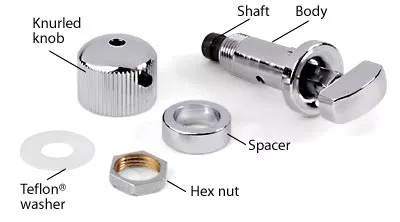 1. Desserrez les 2 hex vis de blocage qui maintiennent le interrupteur de réglage moleté sur l’arbre du tuner et retirez le interrupteur. Retirez la rondelle blanche en Téflon, l’écrou hexagonal et l’entretoise épaisse de l’arbre. |