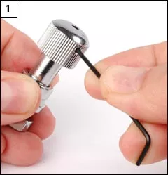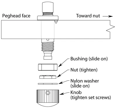 4. Insérez le syntoniseur du côté avant de la tête de lit, en insérant la goupille d'alignement dans le trou pilote. À l'arrière de la tête, installez l'entretoise, puis l'écrou hexagonal. Serrez très soigneusement l’écrou hexagonal : n’exercez qu’une force suffisante pour tirer le tuner jusqu’à la placage de tête. Le corps du tuner est délicat et un serrage excessif le cassera. Installez la rondelle blanche Teflon® et placez le interrupteur de réglage moleté sur l’arbre. Serrez progressivement les deux vis de blocage qui maintiennent le interrupteur en place (ces vis s'insèrent dans la rainure à l'extrémité de l'arbre du tuner). Serrez légèrement une vis, puis l’autre, puis la première à nouveau, en alternant entre les deux au fur et à mesure que vous les serrez. Pour ce faire, agiter le interrupteur pour s’assurer que les vis restent bien en place dans la rainure. De cette façon, le interrupteur restera correctement centré sur l'arbre du tuner. Ne serrez pas trop ces vis de blocage ; s'ils sont trop serrés, leur pression déformera la forme de l'arbre et l'empêchera de tourner librement. Les mécaniques sont lubrifiés. Cependant, si nécessaire, vous pouvez retirer le interrupteur de réglage moleté et placer une PETITE quantité de lubrifiant graphite des deux côtés de la rondelle pour assurer un fonctionnement sans heurts. |