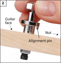 2. Insérez la tige du tuner dans le trou du tuner de 3/8" (10 mm) de votre guitare depuis la face (avant) de votre tête de lit. Notez qu’il y a une broche de positionnement pointue sur la lèvre du tuner. Cette goupille DOIT être positionnée vers l'écrou. Orientez la goupille et appuyez sur le syntoniseur pour faire avec précision une petite marque d’emplacement sur la face de la tête de lit à côté du trou du syntoniseur. |