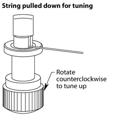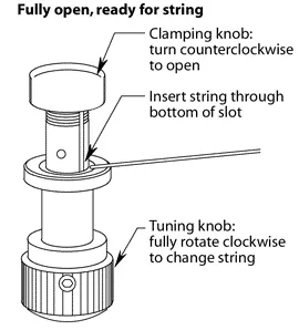 1. Dévissez complètement le interrupteur de réglage (le plus grand interrupteur à l'arrière de la tête) dans le sens des aiguilles d'une montre, de sorte que le trou de la corde soit complètement exposé. 2. Dévissez le interrupteur de serrage (le plus petit interrupteur à l'avant de la tête) dans le sens antihoraire jusqu'à ce que le trou de la chaîne soit complètement ouvert. 3. Insérez la corde dans le trou de la corde dans le tuner. Tirez fermement sur la corde. 4. Serrer la corde dans le tuner en tournant le interrupteur de serrage dans le sens horaire aussi DIFFICILE que possible à la main. Étant donné que la corde E élevée peut s’étirer tellement, inclinez légèrement le trémolo vers l’avant et tirez la corde fermement avant de serrer. Cela ne doit être fait que sur le haut E. Le interrupteur de serrage doit être TRÈS serré pour assurer un réglage stable. 5. Cut the string approximately 1/4" from the tuner post. 6. Réglez la corde avec le interrupteur de réglage. |