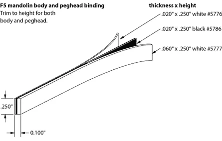L’illustration ci-dessous explique les multiples couches de binding noires et blanches que l’on trouve sur le corps, la placage de tête et le touche d’une mandoline de F5 .