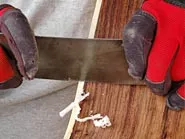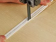 Les joints de mètre sont utilisés lorsque les raccords et les bindings se rencontrent sur les cornière et les angles. Coupez et émerveillez soigneusement pour un bon ajustement, en coupant de petites quantités avec un ciseau aiguisé. Essayer de couper une grande quantité de bois ou de plastique avec une seule coupe risque d’écraser légèrement la binding. Maintenez fermement la binding sur une planche à découper et effectuez de petits mouvements d’office verticaux avec le ciseau. Sur la photo, notez que si le côté plat du ciseau est poli pour un effet miroir brillant, la réflexion vous montre comment la pièce coupée s’adaptera à son accouplement.