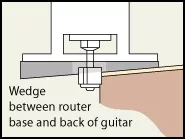 Généralement, l’arc du haut n’est pas suffisant pour causer un problème, mais l’arrière peut le faire. Avant de couper, examinez attentivement pour voir si le trépan de votre routeur est parallèle au côté de la guitare lorsqu’il se déplace autour de la forme du corps. Avec le routeur débranché, étudiez le bit pendant que vous effectuez un cycle à sec. S’il est « à l’intérieur » en raison d’une surface arquée, votre canal de binding sera plus profond en bas qu’en haut. Pour éviter cela, il peut être nécessaire de créer un petit coin sous la base du routeur pour ajuster l’arcade (voir schéma).