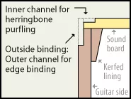 avec un filet supplémentaire à côté nécessite deux canaux. binding Le dessin en coupe montre la forme de marche d’escalier de ces deux canaux. Il s’agit d’une configuration populaire : le dos de la guitare est acheminé pour une seule bande de binding de bord, tandis que le haut est doté d’un anneau supplémentaire pour s’adapter au filet chevrons.