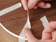 Faites attention avec du ruban adhésif sur du bois nu ! Les bois inachevés, en particulier les épiceries et autres bois de dessus, sont facilement endommagés par le fait de tirer de manière incorrecte du ruban adhésif de leurs surfaces. Pour réduire le risque d’arrachement des fibres souples entre les grains, collez le ruban adhésif sur une chemise en coton pour la rendre peu collante avant de l’appliquer sur votre travail. Même avec du ruban adhésif à faible adhérence, retirez-le lentement et avec précaution : tirez-le selon un angle tel qu’illustré, en le frottant légèrement avec votre index.