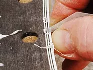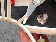 Appliquer de la colle sur une courte section du canal acheminé — environ 15 à 20 cm de canal, en commençant par la couture du bloc de queue. Mettre en place la filet (avec la bordure à chevrons, les « points de flèche » du motif doivent pointer vers le bloc du manche ). Appliquez un peu plus de colle sur le bord extérieur de la filet et placez la bande de bord contre celle-ci dans le canal extérieur. Vous collerez les deux bandes simultanément.