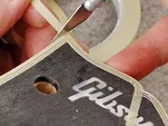 partir du 1,30s et jusqu’à aujourd’hui, de nombreuses têtes de cheville Gibson sont reliées par une seule bande de 0,040 po de largeur. Cela ajoute une ligne de contraste simple pour accentuer la forme de la placage de tête, mais sa finesse signifie que le canal doit être coupé avec très grande précision.