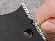 0,040" Ce filet étroit se trouve souvent sur les guitares vintage plus anciennes, les banjos et les mandolines. Sa faible largeur exige que la rainure qui le reçoit soit réalisée avec une grande régularité et une précision extrême. Si le filet dépasse de l’arête de l’instrument, il faut le poncer ou le racler à fleur, ce qui risque d’accentuer son amincissement sur une zone déjà fragile.