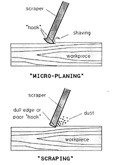 ![]() Les grattoirs rectangulaires sont généralement travaillés avec les deux mains soit en poussant (les pouces ensemble près du centre), soit en tirant (les pouces vers l’extérieur près des extrémités) le long de la pièce à usiner. Voici comment commencer. Tenez le grattoir en position verticale et légèrement inclinée, puis poussez-le doucement sur la pièce en augmentant progressivement l’angle d’attaque jusqu’à ce que la fraise commence à « saisir ». Maintenez l’angle de préhension tout en augmentant la pression de grattage jusqu’à ce qu’un rasage continu commence à se détacher de la fraise. Une fois que vous avez la sensation de l’angle et de la pression « juste à droite », accélérez les coups et voilà : MICRO-PLANING ! Les grattoirs incurvés ou de forme sont généralement tirés d’une main, mais le principal est le même. Travaillez la forme du racloir le long de la forme de pièce correspondante, en position verticale au début, en augmentant l’angle d’attaque jusqu’à ce que vous trouviez un angle « d’accrochage » qui microplanifiera sur toute la forme. Maintenez l’angle de préhension au minimum, juste assez pour faire un rasage continu. Évitez la tendance naturelle à appuyer trop fort à un angle d’attaque trop aigu. L’un ou l’autre cause une chaleur excessive qui décompose la bavure et peut même brûler les pouces et les doigts. De plus, c’est trop de travail. Pour éviter de « laver » la surface de la pièce à usiner, travaillez le racloir sur la ligne de déplacement en alternant l’angle d’inclinaison de chaque côté tous les deux coups ou deux. Ne vous découragez pas si au début vous faites plus de grattage que de micro-planification. C’est en grande partie une question de sentiment que seule la pratique peut enseigner. Mais une fois appris, c’est une compétence que vous aurez pour toujours. »Si la situation devient difficile... » Bien que rare, il est possible que la broche de lustrage durcie se raye. Une chaleur excessive en est la cause : le polissage d’une bavure trop rapide, peut-être une broche sèche. De petits dépôts d’acier plus doux ont tendance à s’accumuler sur la goupille. Le symptôme est un brunissement rugueux ou granuleux. Si cela se produit, essayez ce qui suit. Tout d’abord, tournez la broche vers un nouvel endroit « frais » – serrez la partie exposée de la broche dans un étau ou un mandrin de forage, et tournez doucement la poignée de la lustreuse d’un huitième de tour dans un sens ou dans l’autre. Répétez l’opération si nécessaire, en tournant la poignée dans la même direction à chaque fois. Lorsqu’il n’y a plus de taches lisses, remuer la broche exposée dans une perceuse et tourner doucement la poignée pour la dégager de la broche. Faire tourner la perceuse à vitesse modérée (700 à 1000 tr/min) et appuyer du papier carborundum 6,0 grain humide/sec contre la broche tournante, en la faisant monter et descendre jusqu’à ce que la broche brille comme neuve. Si nécessaire, retournez la goupille dans le mandrin et polissez son autre moitié. Ensuite, réinsérez soigneusement la broche (extrémité effilée en premier) dans la poignée.
