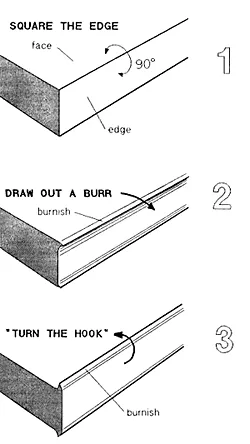 COMMENT FABRIQUER UN TAILLER(60 secondes pour le « micro-planage ») Tout comme les couteaux, les ciseaux et les lames planes très tranchants sont finement aiguisés et hautement polis des deux côtés de leurs arêtes de coupe, un grattoir très tranchant aura une finition miroir polie des deux côtés d’une fraise bien formée. Le processus complet prend généralement trois étapes : 1. SQUARE THE EDGE (instructions détaillées ci-dessous) – Le bord du racloir est d’abord joint – carrément arborant une lime – puis affine à la fois le bord et sa face adjacente. 2. DESSINEZ UNE BRIDE (instructions détaillées ci-dessous) – La lustreuse frotte un vernis élevé le long de la face du bord du grattoir lorsqu’elle sort une bavure. Cette bande étroite d’acier bruni devient la face intérieure du crochet après l’étape 3. 3. « TOURNEZ LE CROCHET » (instructions détaillées ci-dessous) – Le bord extérieur est à la fois poli et remodelé en retournant la fraise tirée avec la lustreuse. Ces deux dernières étapes – dessiner une fraise et tourner le crochet – servent non seulement à polir les deux côtés de la fraise, mais aussi à durcir légèrement la pointe du crochet. Le résultat est une arête de coupe tranchante, dure (mais quelque peu cassante) soutenue par un acier plus dur (moins cassant) sous un ciseau bimétallique qui combine les meilleures propriétés de deux aciers. Une bonne préparation des bords en vaut la peine. Prévoyez de le prendre. Vous obtiendrez un grattoir plus net, plus durable et plus facile à utiliser. Le bloc de guidage simple (illustré à la fin de ces instructions) permettra d’accélérer le processus. Vous aurez également besoin d’une fraise à découper simple de 8 po ou 10 po, d’une lime bastard et d’une fine pierre d’affûtage plate (et de pierres plates rondes pour les racleurs incurvés). |