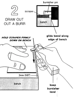 2. L’EXTRACTION D’UNE BAVUREEN PREMIER, L’HUILE DE LA BROCHE DE LA LUSTREUSE – POUR RÉDUIRE L’USURE INÉVITABLE QUI SE PRODUIT LORSQUE L’ACIER RENCONTRE L’ACIER, PLACEZ UNE GOUTTE D’HUILE MACHINE SUR LA BROCHE DANS LA FENTE D’ALIGNEMENT ET UNE AUTRE SUR LA BROCHE EXPOSÉE. Répétez souvent, en particulier au premier signe d’action de brunissage saccadée ou granuleuse. S’il persiste, voir la partie 4 – « Si la situation devient difficile » Tenir fermement le racleur sur une paillasse ou une table solide avec le bord du racleur parallèle au bord de la paillasse et reculer d’environ 3 mm (1/8"). Saisissez la lustreuse comme indiqué et, en commençant par le coin le plus éloigné, baissez de quelques livres et tirez une bavure le long du bord du grattoir, en laissant l’épingle « cliquer » sur le coin le plus proche en environ le temps qu’il faut pour dire « milliers ». Maintenez la lustreuse à niveau (parallèle à la face du racloir) et faites glisser le biseau le long du bord du banc – cela positionne la broche à l’angle idéal pour tirer une bavure en douceur et lui donner une finition miroir. Généralement, un seul coup solide et régulier suffit. Un trop grand nombre de coups peut fragiliser le bord et le fissurer lorsque le crochet est tourné. Les bords incurvés ou de forme spéciale du grattoir sont tirés de la même manière, déplaçant le grattoir selon les besoins pour un support solide près du bord de la paillasse. |