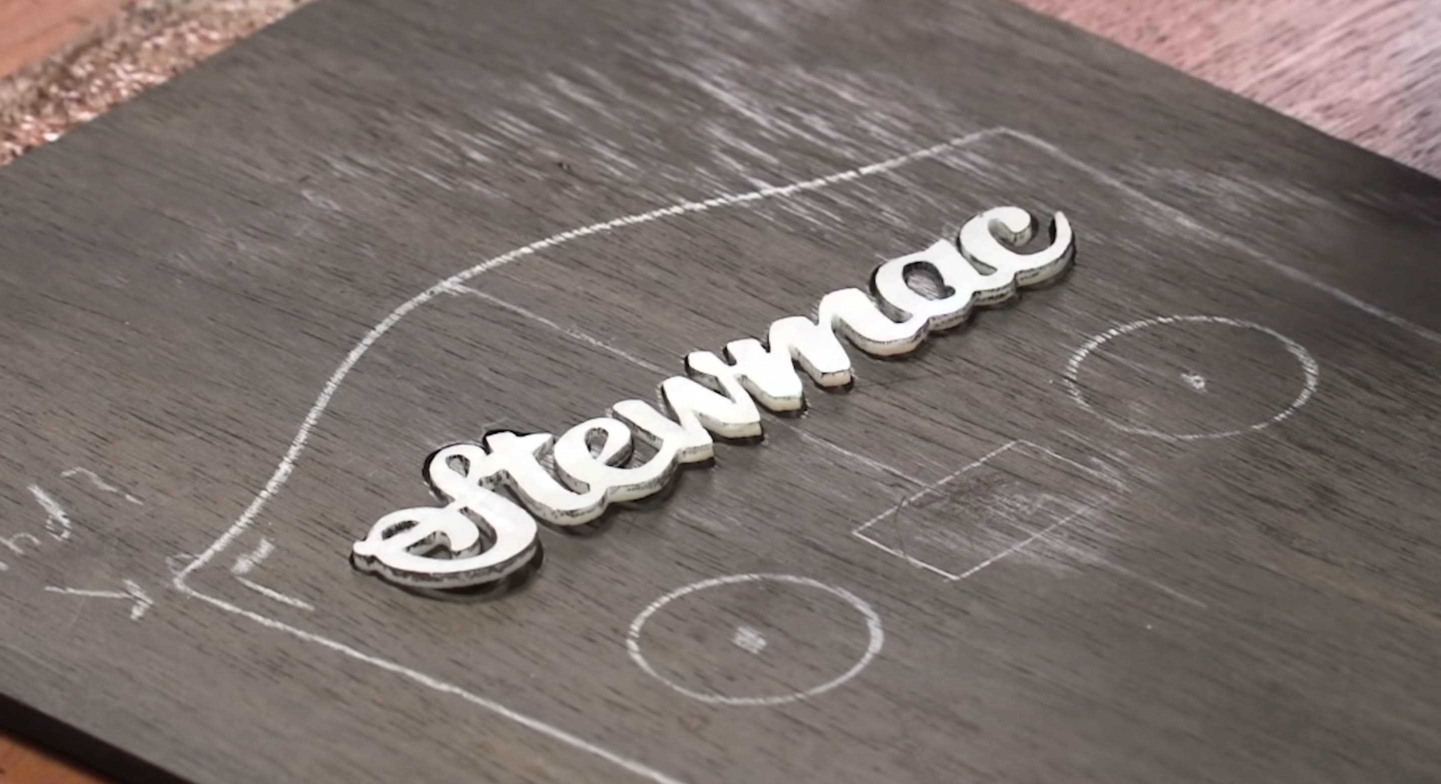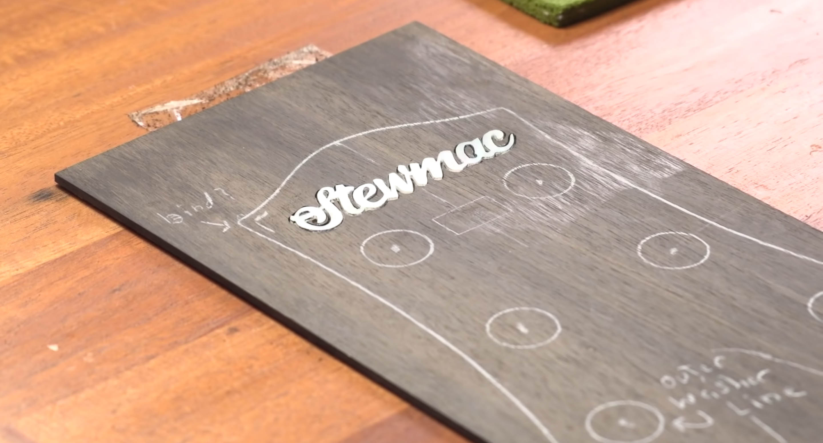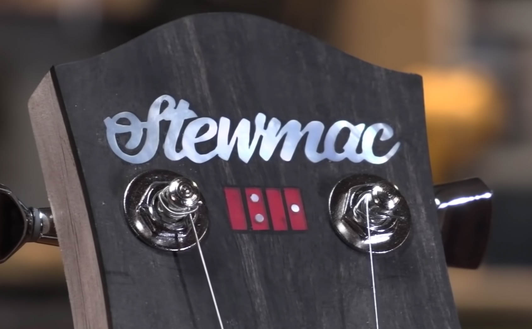 Notre logo est prêt à l’emploi. Comme vous vous en souvenez, il est composé de deux pièces. Le premier est le script qui dit « StewMac » en perle. La deuxième pièce est le petit carton carré fabriqué à partir d’un synthétique appelé Atlante, avec des points repères en nacre .
