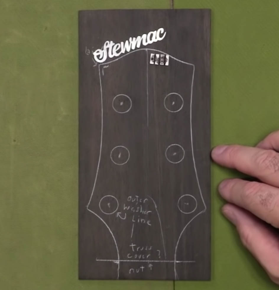 Ce modèle doit être aussi détaillé que possible. Vous devez avoir vos trous de tuner. Vous devez savoir où va votre couvercle de tige de réglage , si vous en avez un. Vous devez savoir où se trouve l’ écrou . Vous devez savoir si vous avez une liaison en cours et combien d’espace cela prend. Vous devez savoir ce que votre rondelle tuner ou l’espace de la douille occupera parce que vous ne voulez vraiment pas couvrir l’inlay.