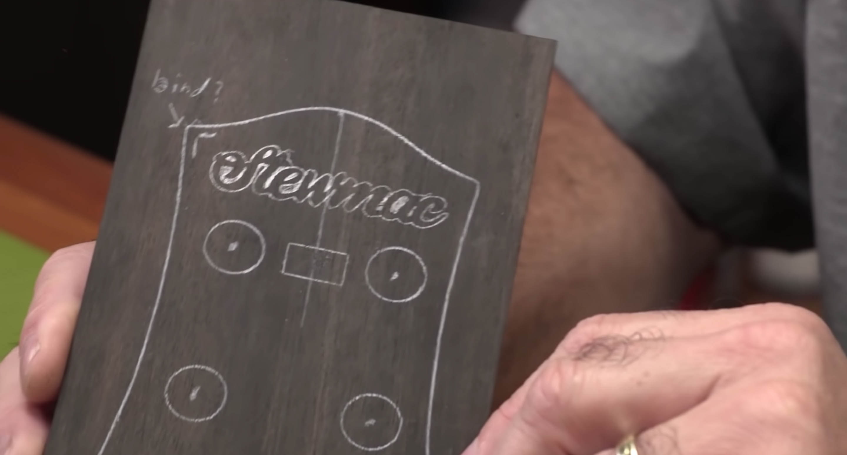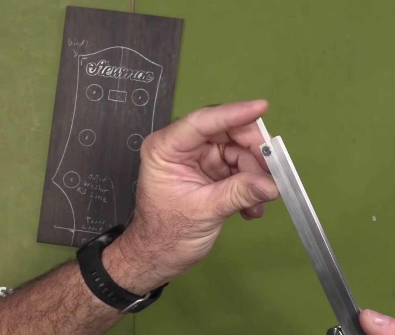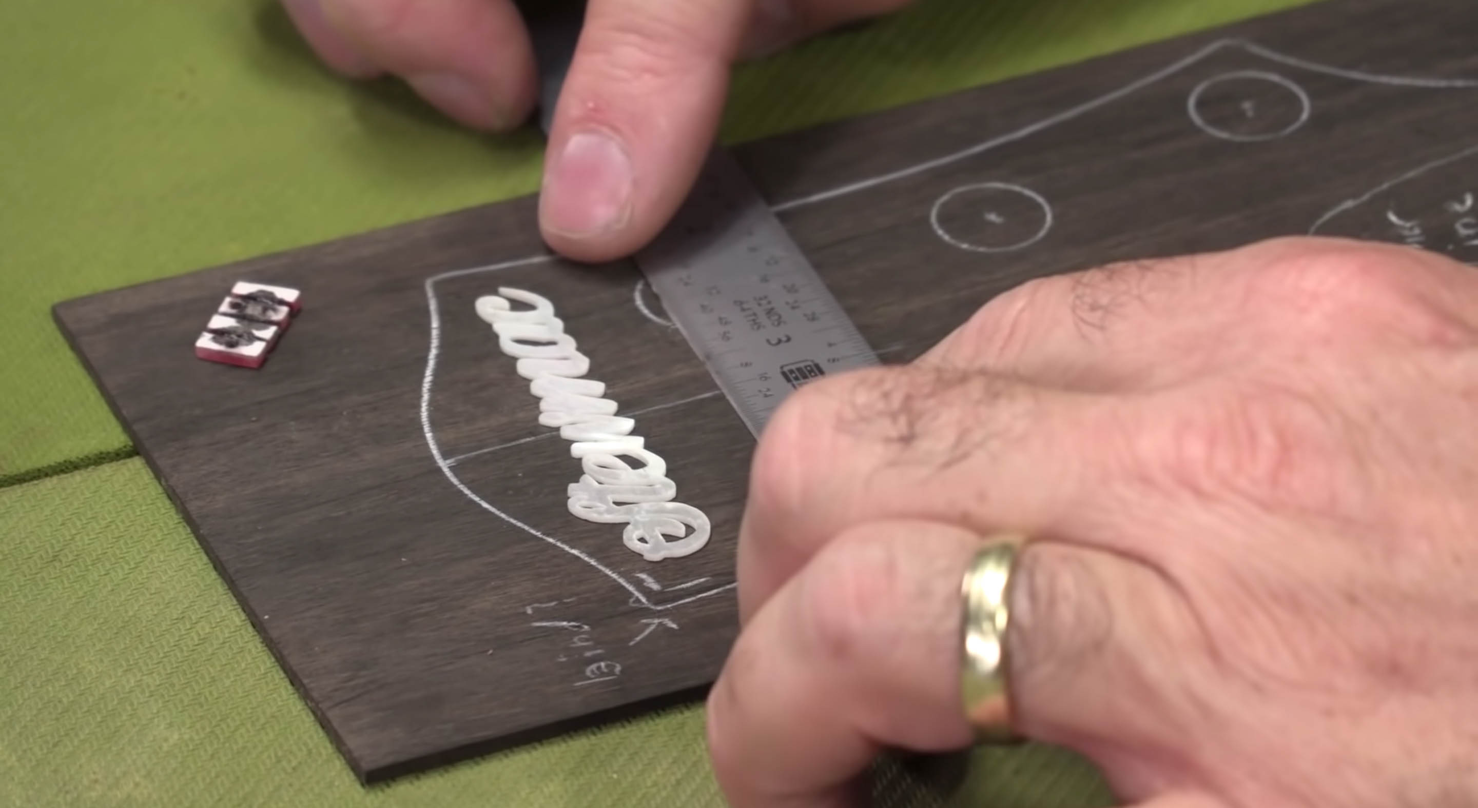 Prenez une règle ou une règle droite et trouvez l’endroit où vous voulez que votre inlay aille. N’oubliez pas de faire très attention à votre logo en nacre. Ne le manipulez pas ; c’est délicat.