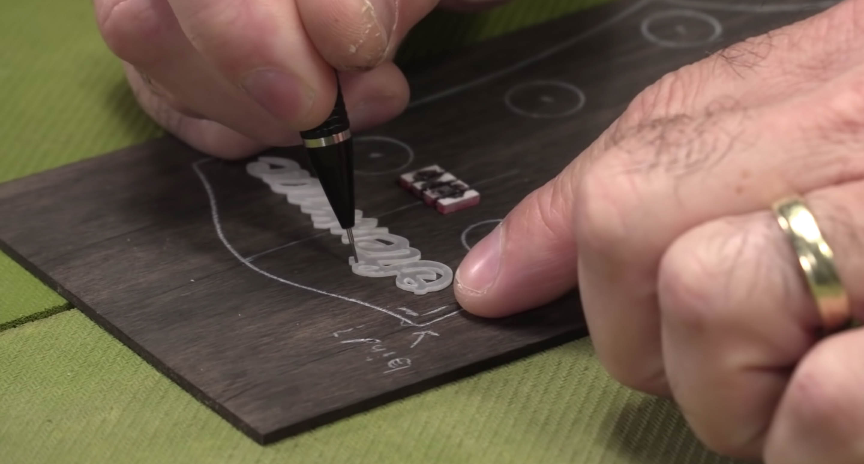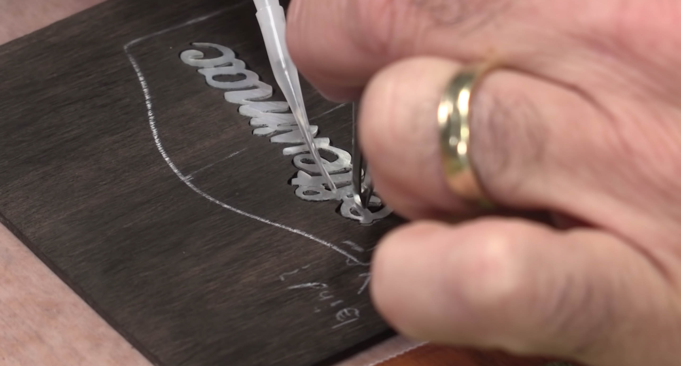 Traditionnellement, les gens aiment utiliser un scribe métallique pour tracer leur design. Pour une incrustation qui n'est pas fragile, ce n'est pas grave. Dans ce cas, cependant, le scribe va être trop volumineux pour s’adapter confortablement à ces lettres. De plus, le scribe est un morceau de métal très solide, et il pourrait abîmer l’ébène, voire casser les parties les plus fragiles du motif perlé.